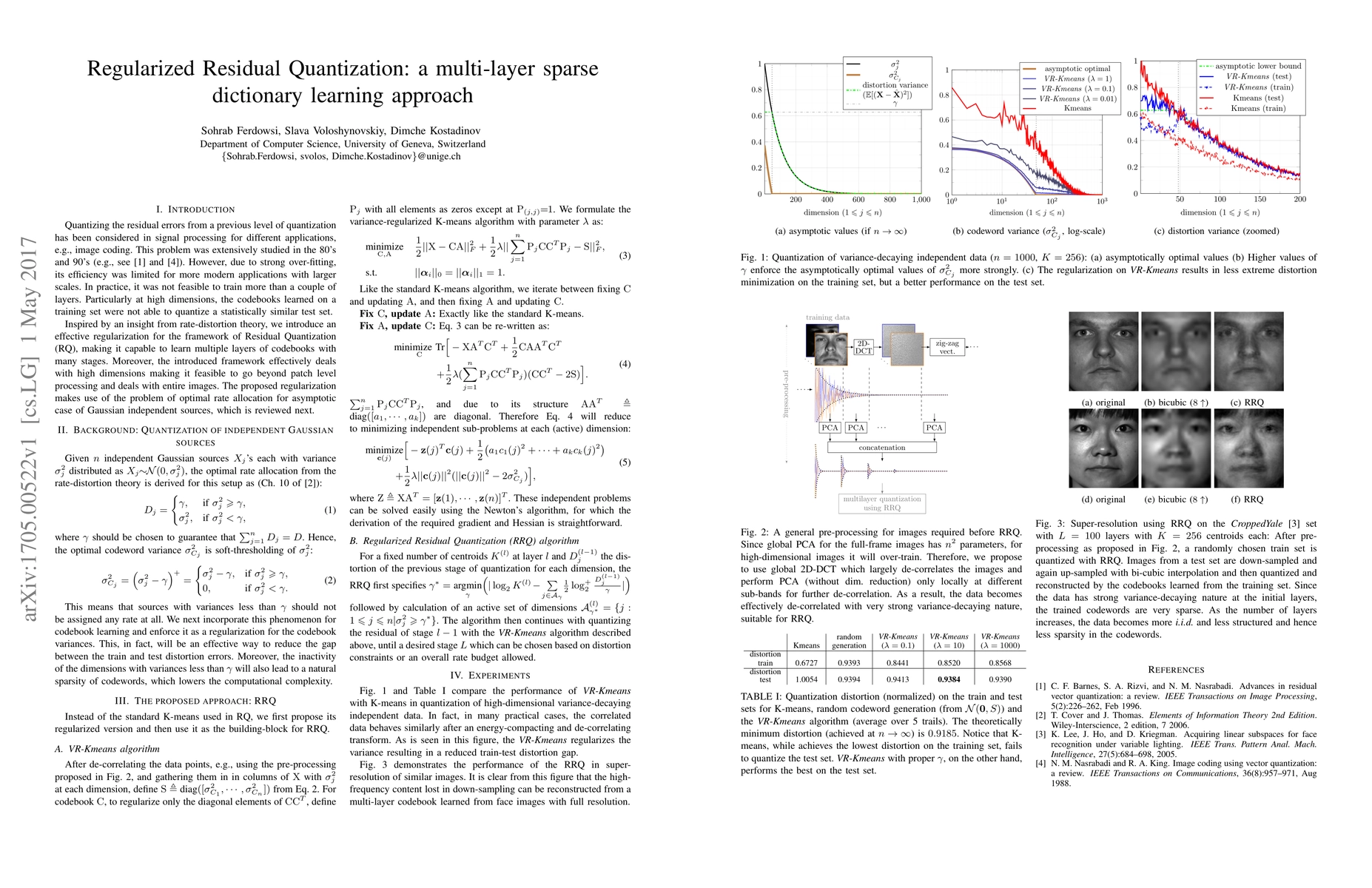 The Residual Quantization (RQ) framework is revisited where the quantization distortion is being successively reduced in multi-layers. Inspired by the reverse-water-filling paradigm in rate-distortion theory, an efficient regularization on the variances of the codewords is introduced which allows to extend the RQ for very large numbers of layers and also for high dimensional data, without getting over-trained. The proposed Regularized Residual Quantization (RRQ) results in multi-layer dictionaries which are additionally sparse, thanks to the soft-thresholding nature of the regularization when applied to variance-decaying data which can arise from de-correlating transformations applied to correlated data. Furthermore, we also propose a general-purpose pre-processing for natural images which makes them suitable for such quantization. The RRQ framework is first tested on synthetic variance-decaying data to show its efficiency in quantization of high-dimensional data. Next, we use the RRQ in super-resolution of a database of facial images where it is shown that low-resolution facial images from the test set quantized with codebooks trained on high-resolution images from the training set show relevant high-frequency content when reconstructed with those codebooks.