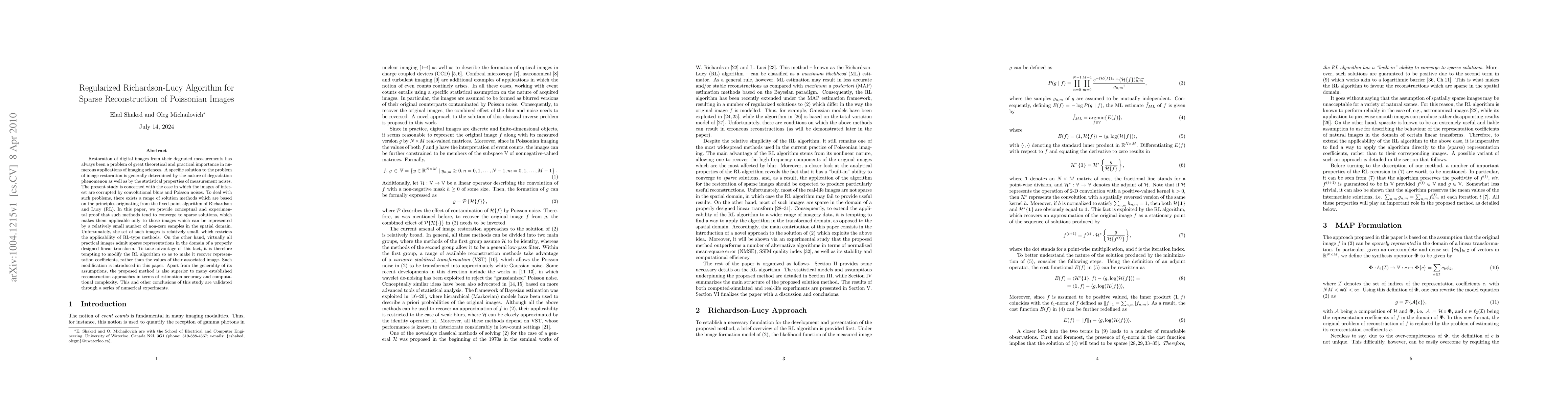 The paper introduces a regularized version of the Richardson-Lucy (RL) algorithm for sparse reconstruction of Poissonian images, utilizing a properly designed linear transform to exploit the sparsity of practical images in their transform domain.
