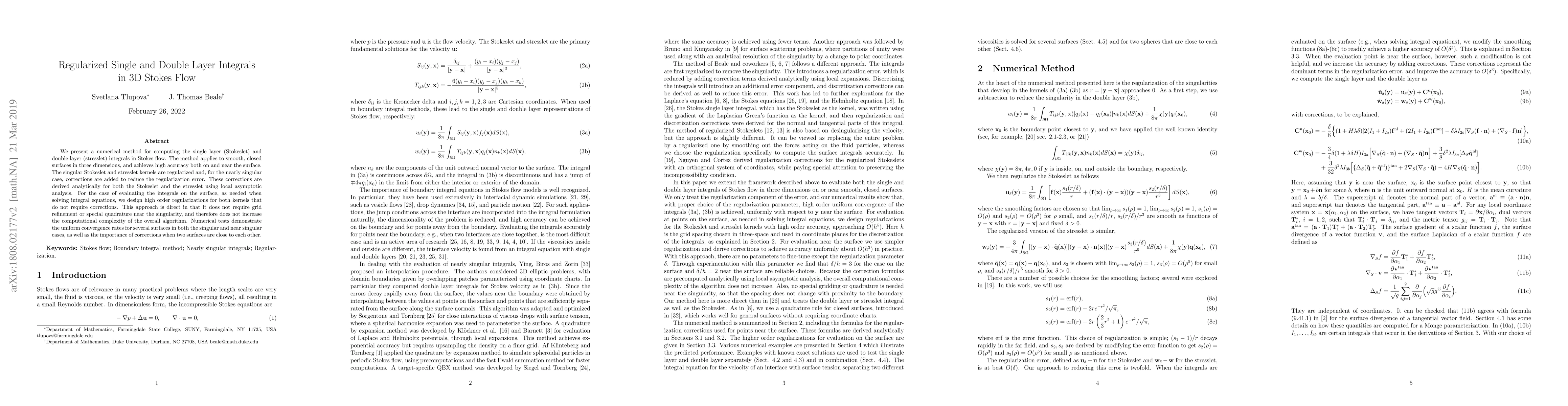 This paper introduces a numerical method for accurately computing single and double layer integrals in 3D Stokes flow, regularizing singular kernels and adding corrections to reduce errors, which maintains high accuracy near surfaces without increasing computational complexity. Numerical tests confirm uniform convergence and the necessity of corrections for closely positioned surfaces.