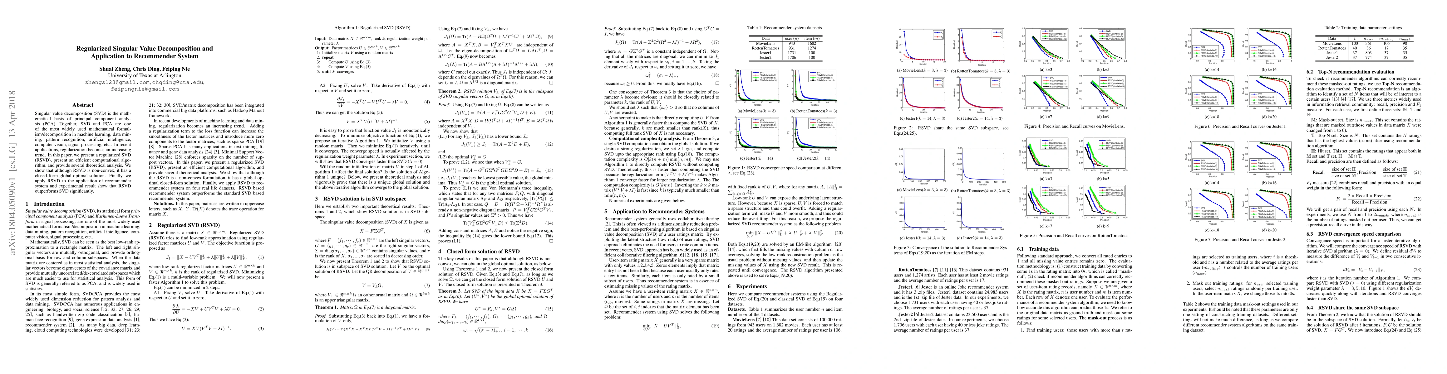 Singular value decomposition (SVD) is the mathematical basis of principal component analysis (PCA). Together, SVD and PCA are one of the most widely used mathematical formalism/decomposition in machine learning, data mining, pattern recognition, artificial intelligence, computer vision, signal processing, etc. In recent applications, regularization becomes an increasing trend. In this paper, we present a regularized SVD (RSVD), present an efficient computational algorithm, and provide several theoretical analysis. We show that although RSVD is non-convex, it has a closed-form global optimal solution. Finally, we apply RSVD to the application of recommender system and experimental result show that RSVD outperforms SVD significantly.