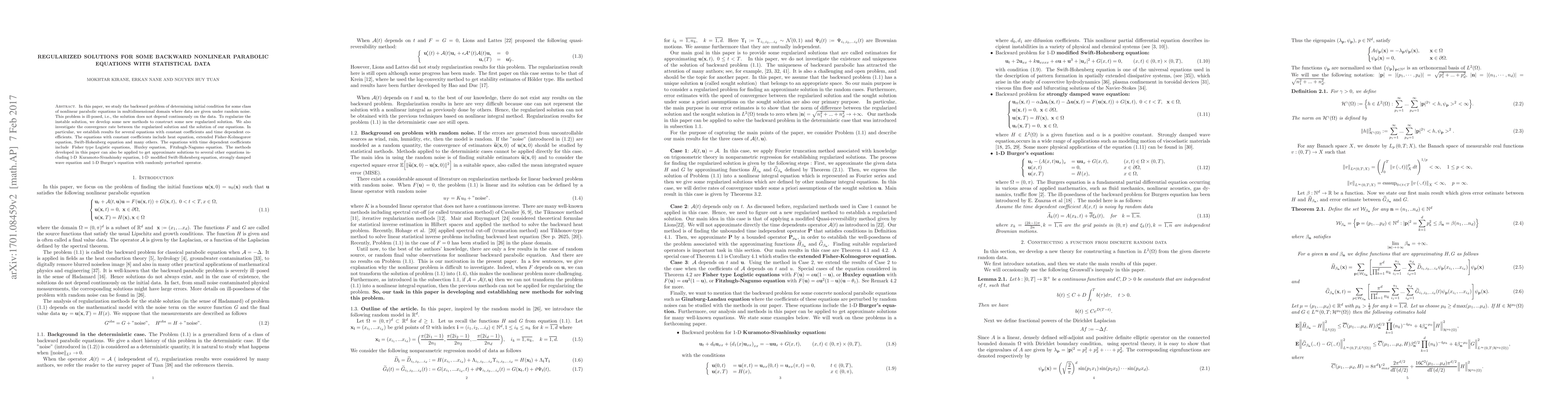In this paper, we study the backward problem of determining initial condition for some class of nonlinear parabolic equations in multidimensional domain where data are given under random noise. This problem is ill-posed, i.e., the solution does not depend continuously on the data. To regularize the instable solution, we develop some new methods to construct some new regularized solution. We also investigate the convergence rate between the regularized solution and the solution of our equations. In particular, we establish results for several equations with constant coefficients and time dependent coefficients. The equations with constant coefficients include heat equation, extended Fisher-Kolmogorov equation, Swift-Hohenberg equation and many others. The equations with time dependent coefficients include Fisher type Logistic equations, Huxley equation, Fitzhugh-Nagumo equation. The methods developed in this paper can also be applied to get approximate solutions to several other equations including 1-D Kuramoto-Sivashinsky equation, 1-D modified Swift-Hohenberg equation, strongly damped wave equation and 1-D Burger's equation with randomly perturbed operator.