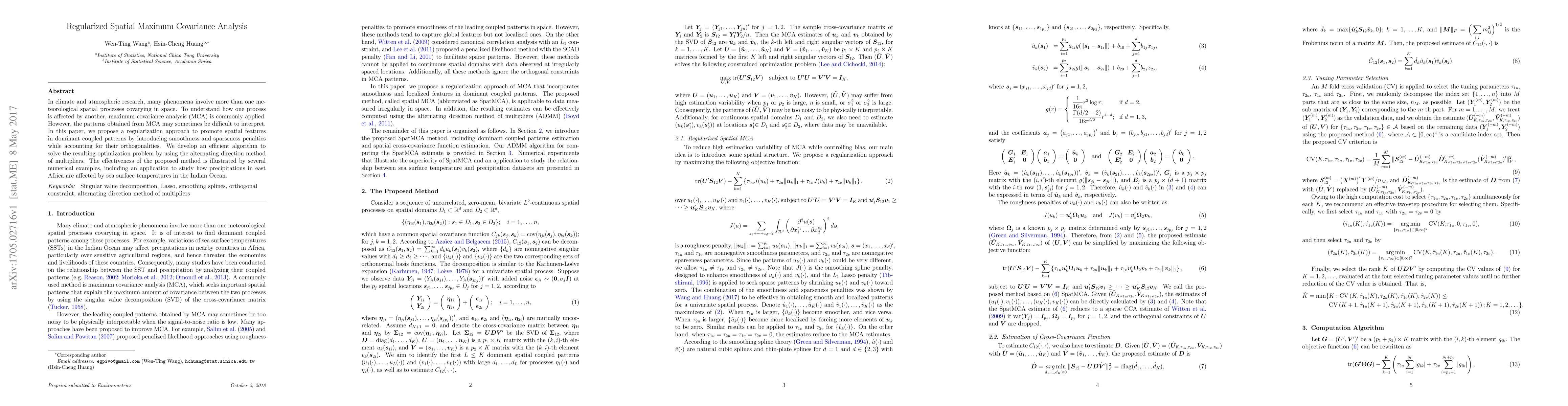 In climate and atmospheric research, many phenomena involve more than one meteorological spatial processes covarying in space. To understand how one process is affected by another, maximum covariance analysis (MCA) is commonly applied. However, the patterns obtained from MCA may sometimes be difficult to interpret. In this paper, we propose a regularization approach to promote spatial features in dominant coupled patterns by introducing smoothness and sparseness penalties while accounting for their orthogonalities. We develop an efficient algorithm to solve the resulting optimization problem by using the alternating direction method of multipliers. The effectiveness of the proposed method is illustrated by several numerical examples, including an application to study how precipitations in east Africa are affected by sea surface temperatures in the Indian Ocean.