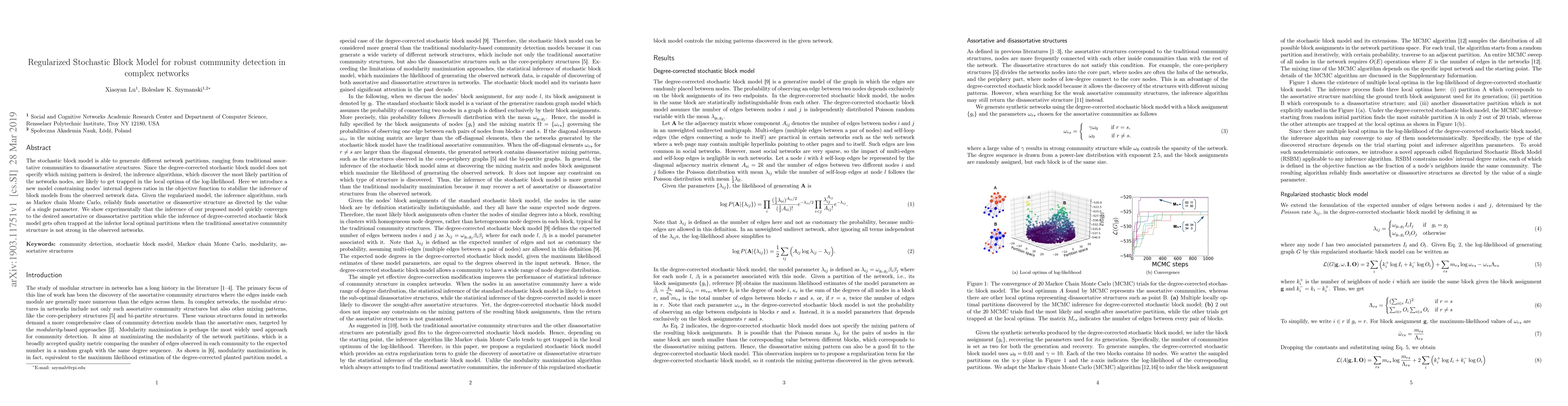 This paper proposes a regularized stochastic block model to improve community detection in complex networks by stabilizing inference algorithms. The model constrains nodes' internal degrees ratios, allowing reliable identification of assortative or disassortative structures, and demonstrates faster convergence compared to the traditional degree-corrected stochastic block model.