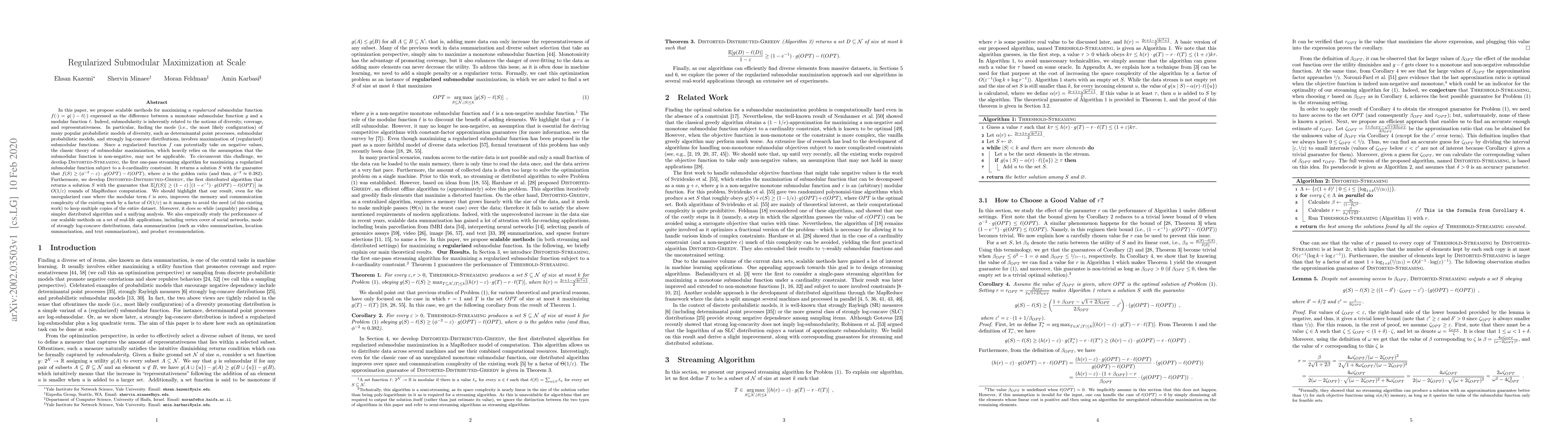 This paper proposes scalable methods for maximizing regularized submodular functions, which are the difference between a monotone submodular function and a modular function. It introduces the first one-pass streaming algorithm and a distributed MapReduce algorithm for this purpose, achieving improved memory and communication efficiency. The methods are tested on applications like data summarization and product recommendation.