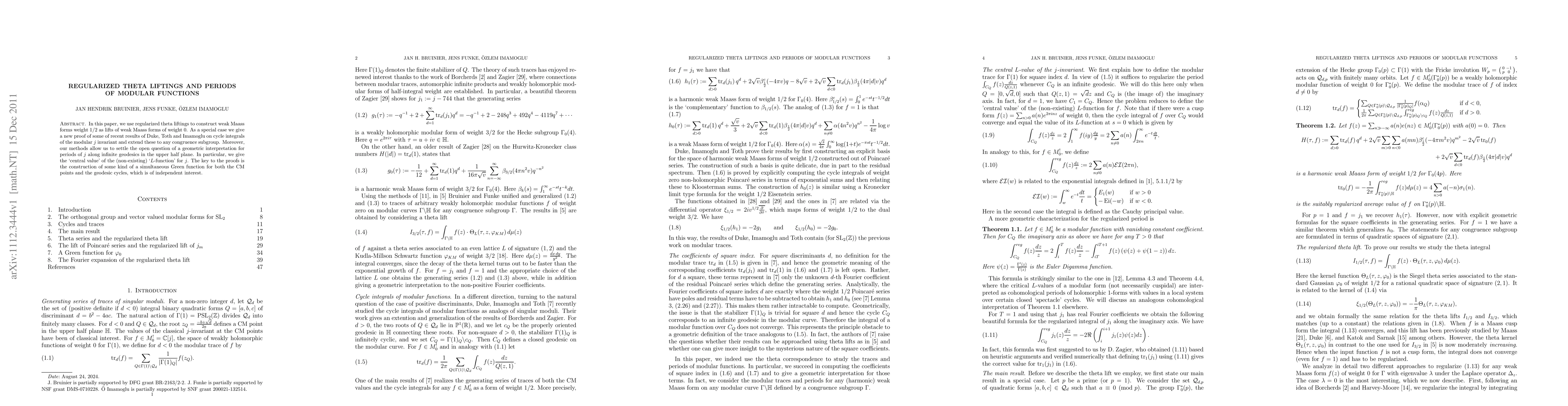 This paper constructs weak Maass forms of weight 1/2 using regularized theta liftings, proving results on cycle integrals of the modular j-invariant and providing a geometric interpretation for periods of j along infinite geodesics. The key tool is a simultaneous Green function for CM points and geodesic cycles.