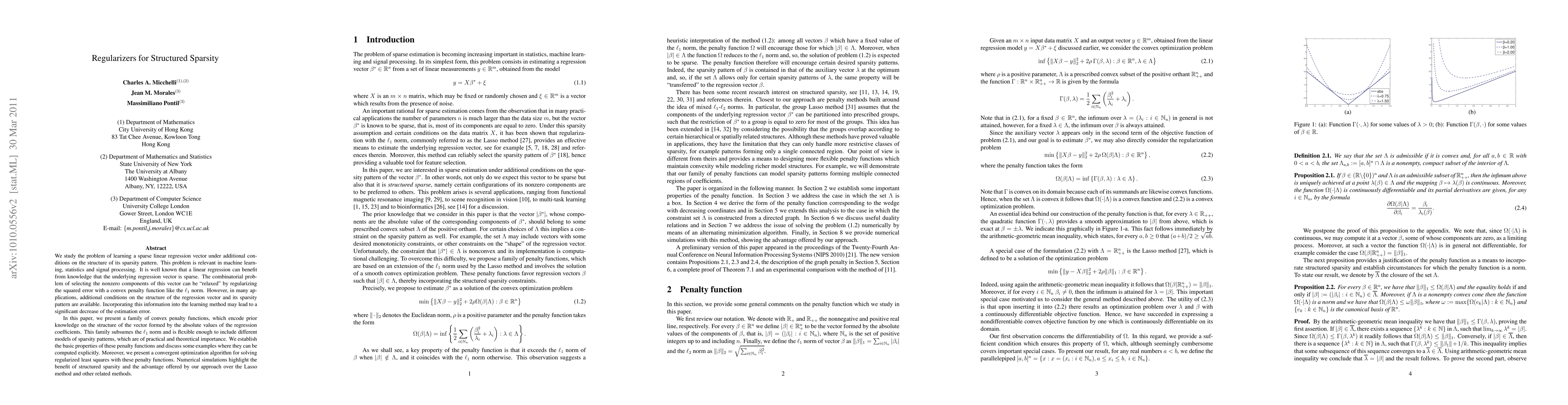 We study the problem of learning a sparse linear regression vector under additional conditions on the structure of its sparsity pattern. This problem is relevant in machine learning, statistics and signal processing. It is well known that a linear regression can benefit from knowledge that the underlying regression vector is sparse. The combinatorial problem of selecting the nonzero components of this vector can be "relaxed" by regularizing the squared error with a convex penalty function like the $\ell_1$ norm. However, in many applications, additional conditions on the structure of the regression vector and its sparsity pattern are available. Incorporating this information into the learning method may lead to a significant decrease of the estimation error. In this paper, we present a family of convex penalty functions, which encode prior knowledge on the structure of the vector formed by the absolute values of the regression coefficients. This family subsumes the $\ell_1$ norm and is flexible enough to include different models of sparsity patterns, which are of practical and theoretical importance. We establish the basic properties of these penalty functions and discuss some examples where they can be computed explicitly. Moreover, we present a convergent optimization algorithm for solving regularized least squares with these penalty functions. Numerical simulations highlight the benefit of structured sparsity and the advantage offered by our approach over the Lasso method and other related methods.