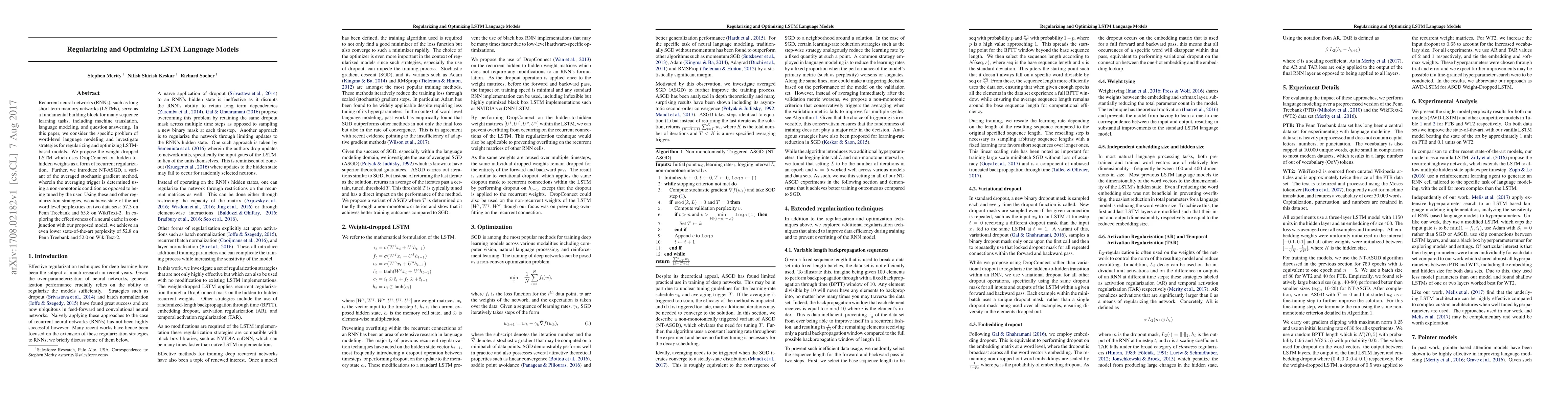 The paper introduces the weight-dropped LSTM with DropConnect for recurrent regularization and NT-ASGD, an averaged stochastic gradient method with a non-monotonic averaging trigger.