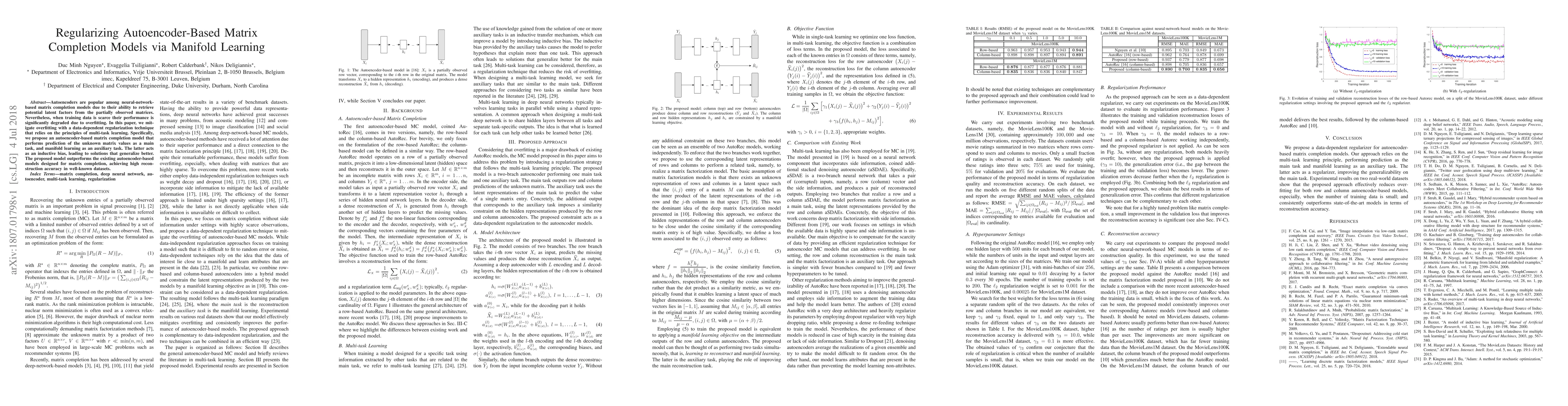Autoencoders are popular among neural-network-based matrix completion models due to their ability to retrieve potential latent factors from the partially observed matrices. Nevertheless, when training data is scarce their performance is significantly degraded due to overfitting. In this paper, we mit- igate overfitting with a data-dependent regularization technique that relies on the principles of multi-task learning. Specifically, we propose an autoencoder-based matrix completion model that performs prediction of the unknown matrix values as a main task, and manifold learning as an auxiliary task. The latter acts as an inductive bias, leading to solutions that generalize better. The proposed model outperforms the existing autoencoder-based models designed for matrix completion, achieving high reconstruction accuracy in well-known datasets.