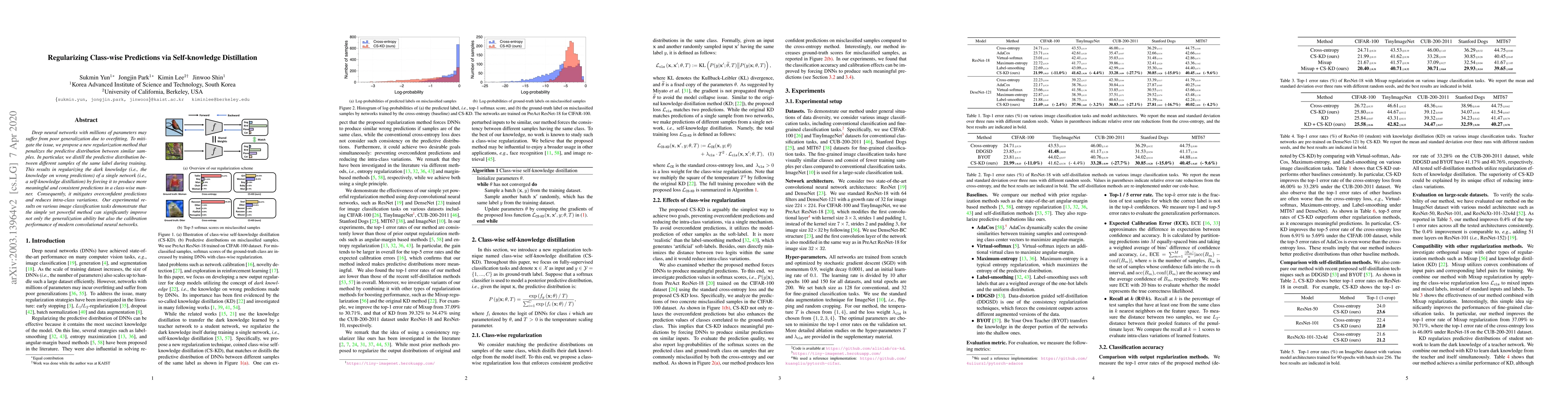 Deep neural networks with millions of parameters may suffer from poor generalization due to overfitting. To mitigate the issue, we propose a new regularization method that penalizes the predictive distribution between similar samples. In particular, we distill the predictive distribution between different samples of the same label during training. This results in regularizing the dark knowledge (i.e., the knowledge on wrong predictions) of a single network (i.e., a self-knowledge distillation) by forcing it to produce more meaningful and consistent predictions in a class-wise manner. Consequently, it mitigates overconfident predictions and reduces intra-class variations. Our experimental results on various image classification tasks demonstrate that the simple yet powerful method can significantly improve not only the generalization ability but also the calibration performance of modern convolutional neural networks.
