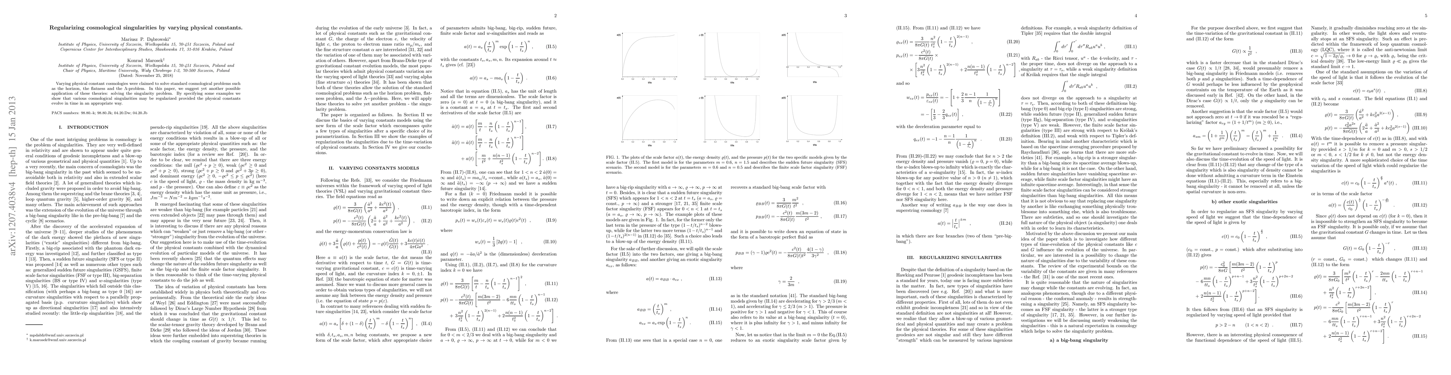 Varying physical constant cosmologies were claimed to solve standard cosmological problems such as the horizon, the flatness and the $\Lambda$-problem. In this paper, we suggest yet another possible application of these theories: solving the singularity problem. By specifying some examples we show that various cosmological singularities may be regularized provided the physical constants evolve in time in an appropriate way.