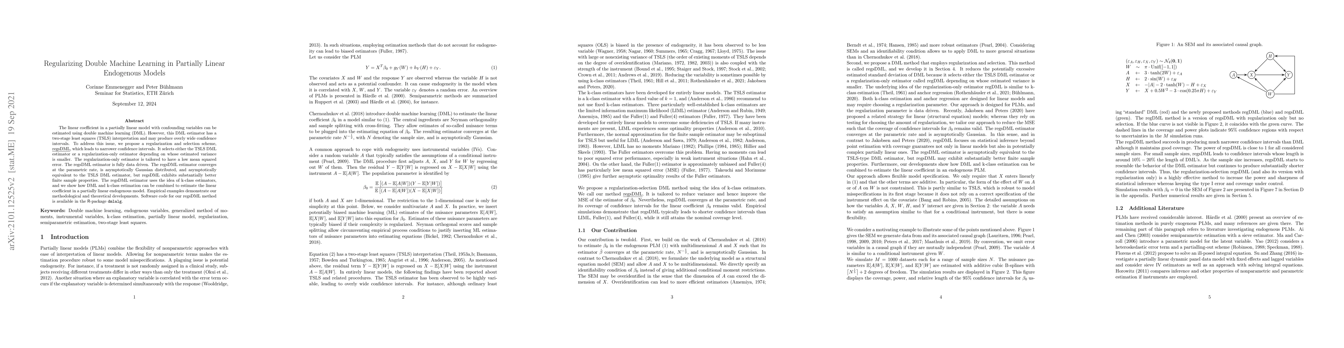 The linear coefficient in a partially linear model with confounding variables can be estimated using double machine learning (DML). However, this DML estimator has a two-stage least squares (TSLS) interpretation and may produce overly wide confidence intervals. To address this issue, we propose a regularization and selection scheme, regsDML, which leads to narrower confidence intervals. It selects either the TSLS DML estimator or a regularization-only estimator depending on whose estimated variance is smaller. The regularization-only estimator is tailored to have a low mean squared error. The regsDML estimator is fully data driven. The regsDML estimator converges at the parametric rate, is asymptotically Gaussian distributed, and asymptotically equivalent to the TSLS DML estimator, but regsDML exhibits substantially better finite sample properties. The regsDML estimator uses the idea of k-class estimators, and we show how DML and k-class estimation can be combined to estimate the linear coefficient in a partially linear endogenous model. Empirical examples demonstrate our methodological and theoretical developments. Software code for our regsDML method is available in the R-package dmlalg.