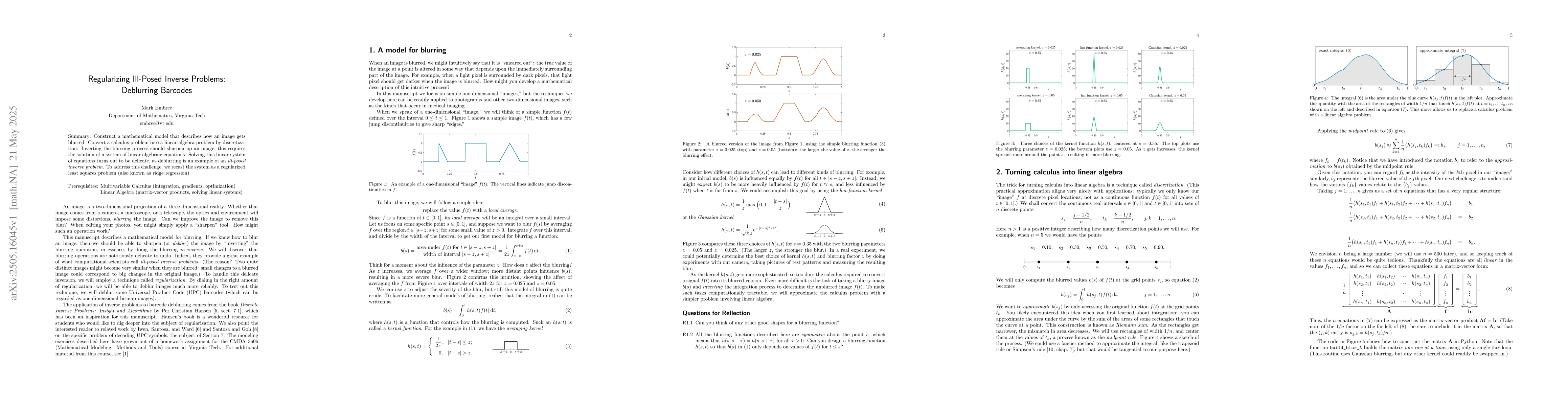 The paper introduces students to regularization for ill-posed inverse problems, focusing on deblurring barcodes. It constructs a mathematical model for blurring, converts the problem into a linear algebra problem via discretization, and addresses the delicate process of solving the linear system through regularized least squares (ridge regression).