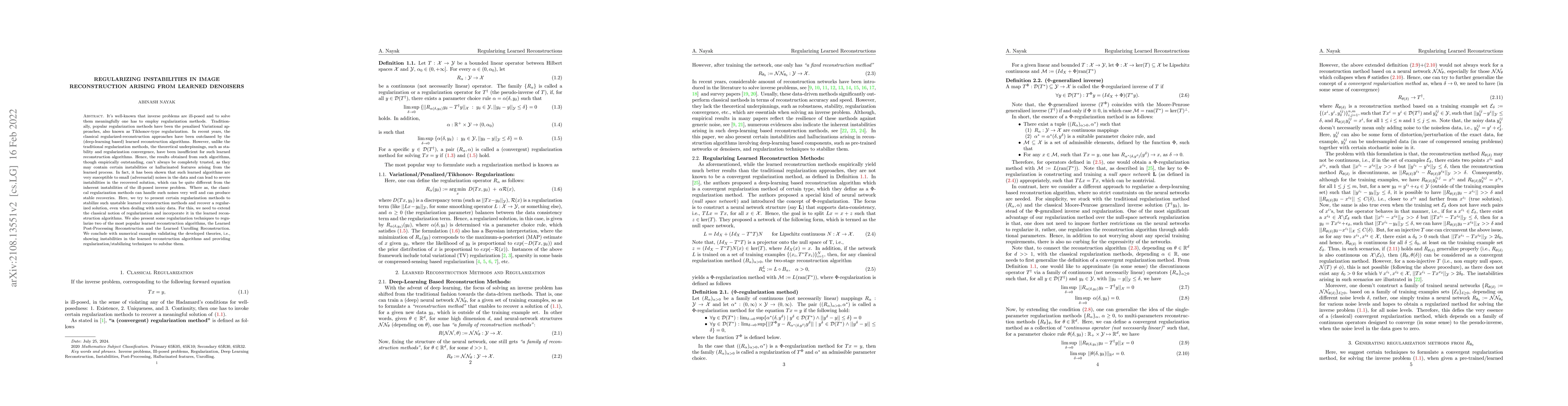 This paper addresses the instability issues in image reconstruction from learned denoisers by proposing regularization methods to stabilize these algorithms. It extends classical regularization techniques to learned reconstruction methods to improve stability and reliability, especially in the presence of adversarial noise.