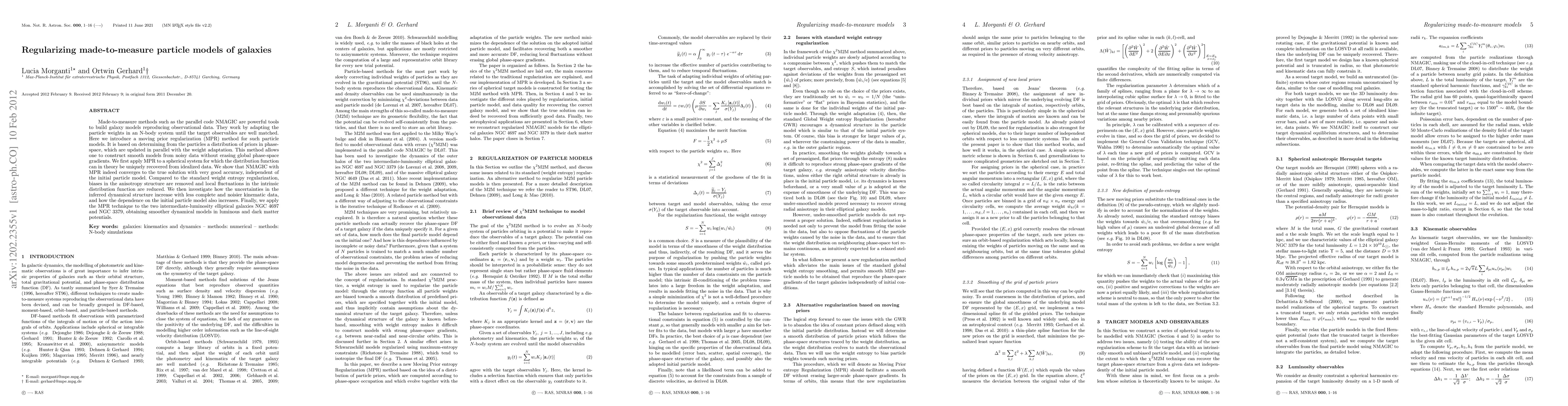 Made-to-measure methods such as the parallel code NMAGIC are powerful tools to build galaxy models reproducing observational data. They work by adapting the particle weights in an N-body system until the target observables are well matched. Here we introduce a moving prior regularization (MPR) method for such particle models. It is based on determining from the particles a distribution of priors in phase-space, which are updated in parallel with the weight adaptation. This method allows one to construct smooth models from noisy data without erasing global phase-space gradients. We first apply MPR to a spherical system for which the distribution function can in theory be uniquely recovered from idealized data. We show that NMAGIC with MPR indeed converges to the true solution with very good accuracy, independent of the initial particle model. Compared to the standard weight entropy regularization, biases in the anisotropy structure are removed and local fluctuations in the intrinsic distribution function are reduced. We then investigate how the uncertainties in the inferred dynamical structure increase with less complete and noisier kinematic data, and how the dependence on the initial particle model also increases. Finally, we apply the MPR technique to the two intermediate-luminosity elliptical galaxies NGC 4697 and NGC 3379, obtaining smoother dynamical models in luminous and dark matter potentials.