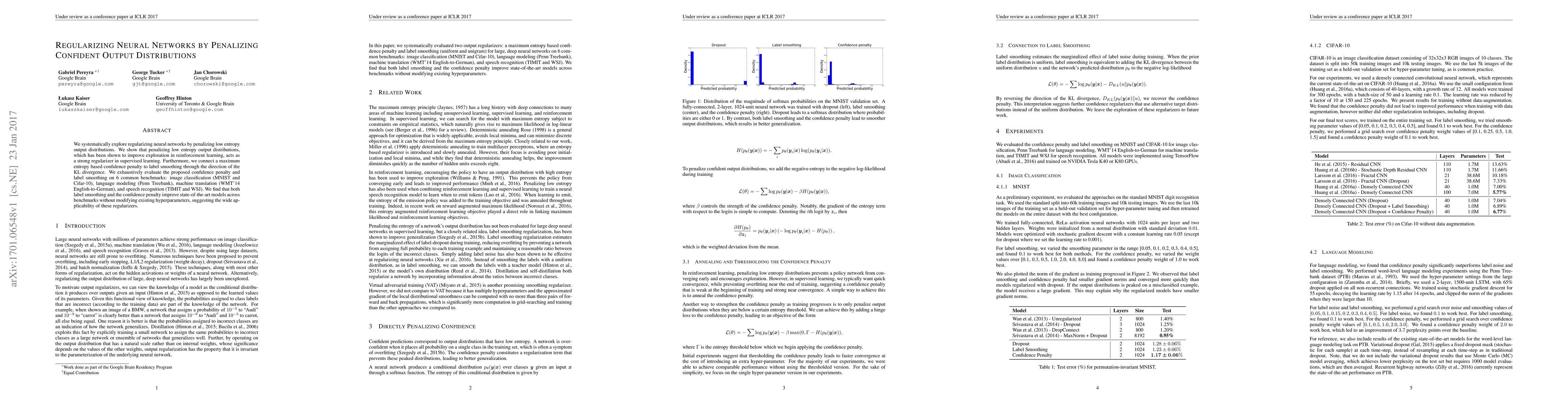 We systematically explore regularizing neural networks by penalizing low entropy output distributions. We show that penalizing low entropy output distributions, which has been shown to improve exploration in reinforcement learning, acts as a strong regularizer in supervised learning. Furthermore, we connect a maximum entropy based confidence penalty to label smoothing through the direction of the KL divergence. We exhaustively evaluate the proposed confidence penalty and label smoothing on 6 common benchmarks: image classification (MNIST and Cifar-10), language modeling (Penn Treebank), machine translation (WMT'14 English-to-German), and speech recognition (TIMIT and WSJ). We find that both label smoothing and the confidence penalty improve state-of-the-art models across benchmarks without modifying existing hyperparameters, suggesting the wide applicability of these regularizers.