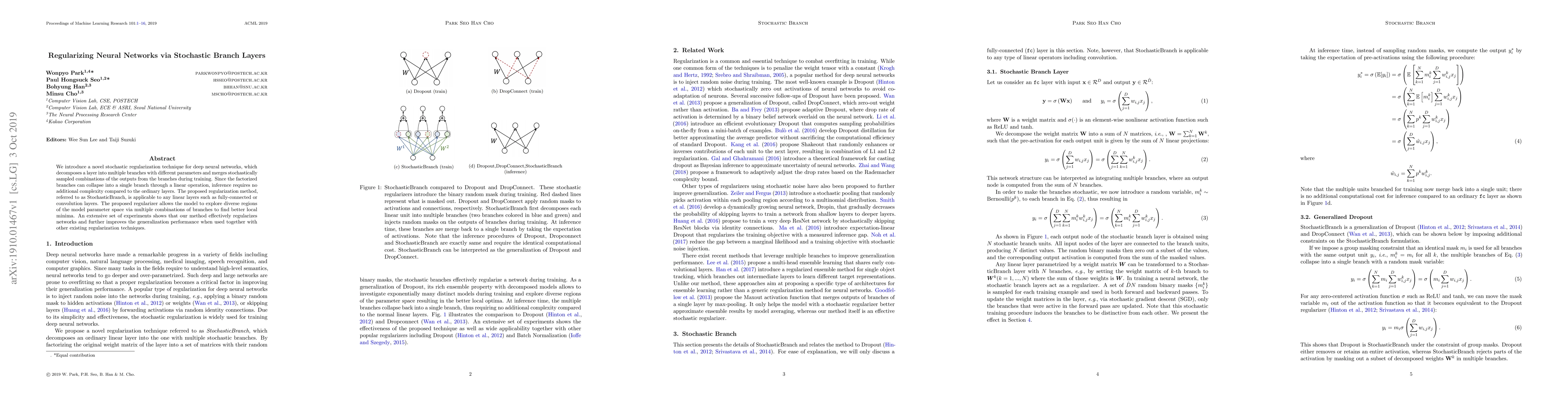 This paper proposes StochasticBranch, a novel regularization technique for deep neural networks that splits a layer into multiple branches with different parameters, merging their outputs during training. This method enhances generalization without increasing inference complexity and works with any linear layers.