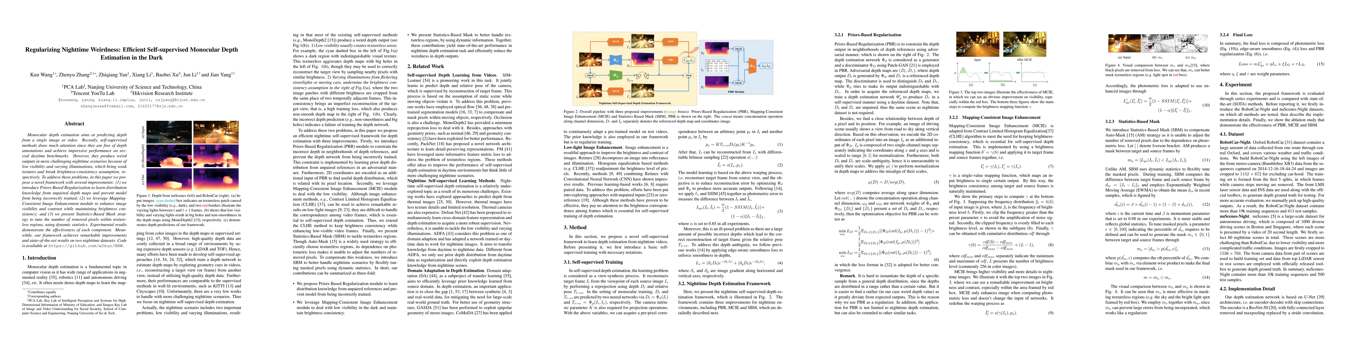 This paper proposes a novel framework for self-supervised monocular depth estimation under low-visibility nighttime conditions, addressing issues like weak textures and broken brightness consistency. The framework includes Priors-Based Regularization, Mapping-Consistent Image Enhancement, and Statistics-Based Mask strategy, achieving state-of-the-art results on nighttime datasets.