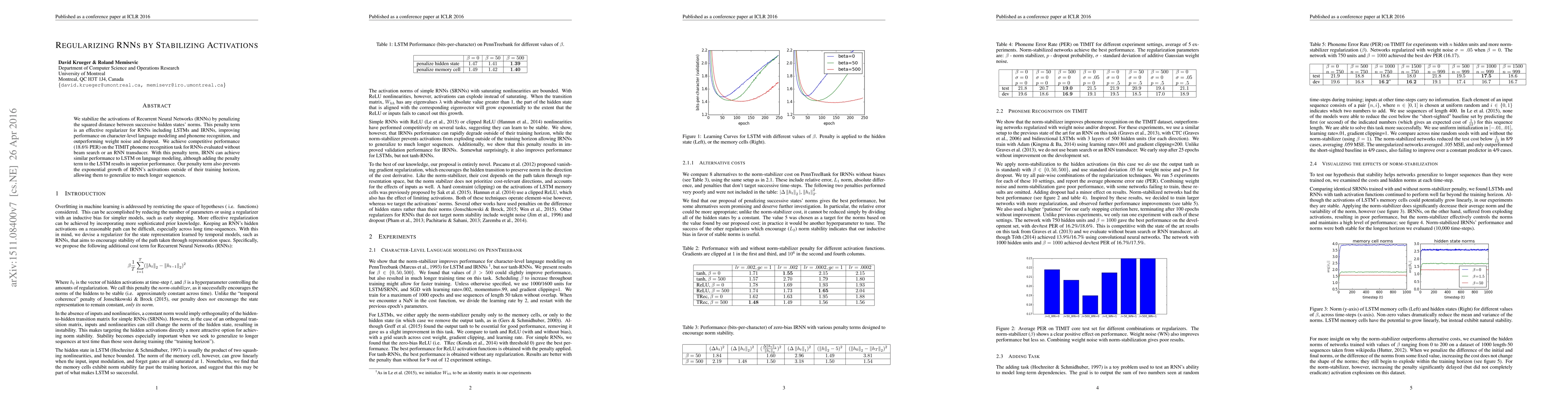 This paper proposes a regularization technique for Recurrent Neural Networks (RNNs) that improves performance on tasks like character-level language modeling and phoneme recognition, while preventing over-activation and generalizing well to longer sequences.