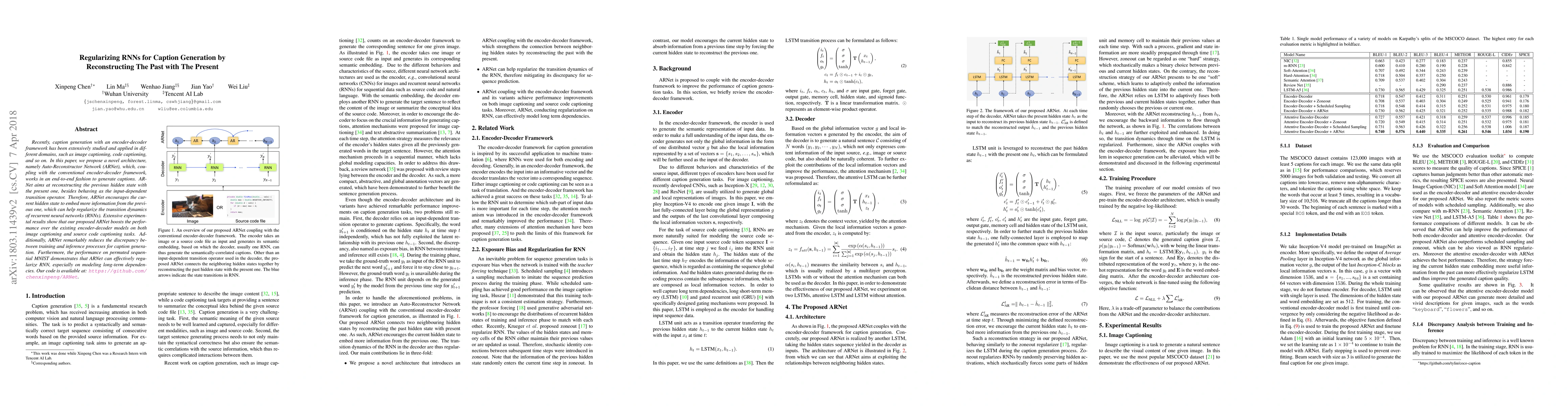A new architecture, Auto-Reconstructor Network (ARNet), is proposed to regularize RNNs for caption generation by reconstructing the past with the present, improving performance on image and source code captioning tasks.