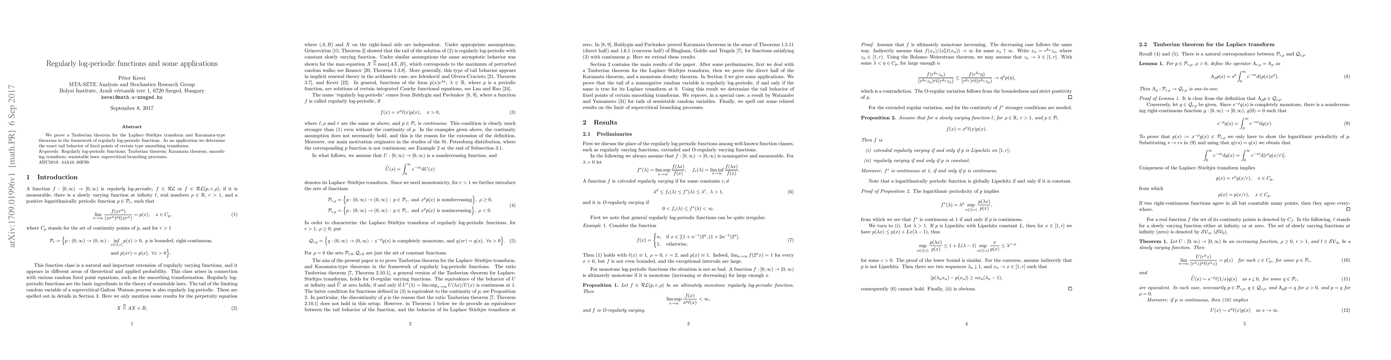 We prove a Tauberian theorem for the Laplace--Stieltjes transform and Karamata-type theorems in the framework of regularly log-periodic functions. As an application we determine the exact tail behavior of fixed points of certain type smoothing transforms.