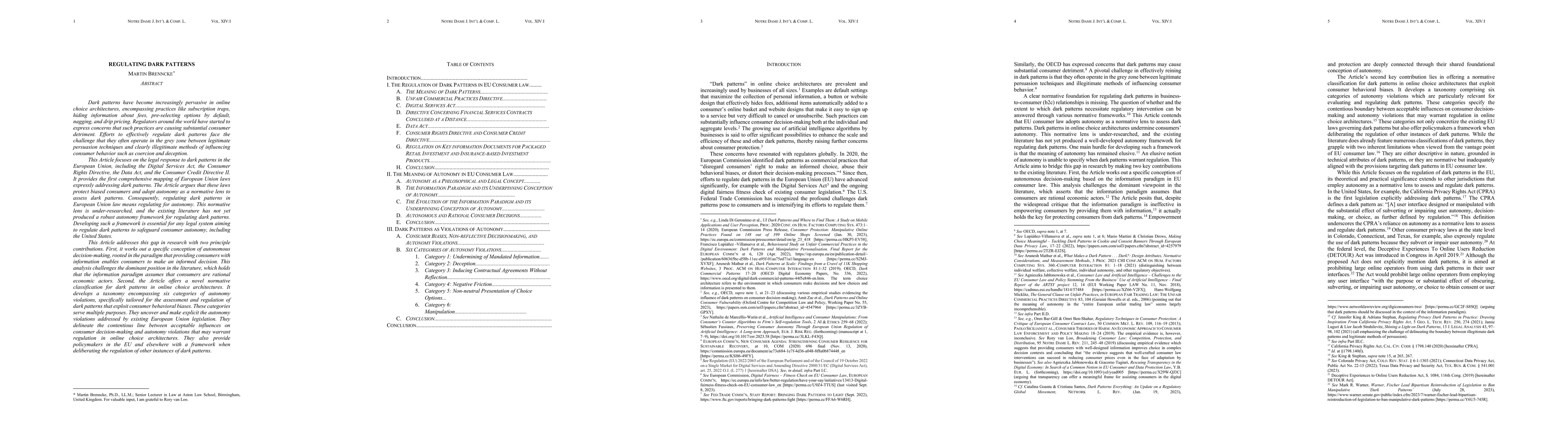 Dark patterns have become increasingly pervasive in online choice architectures, encompassing practices like subscription traps, hiding information about fees, pre-selecting options by default, nagging, and drip pricing. Regulators around the world have started to express concerns that such practices are causing substantial consumer detriment. This Article focuses on the legal response to dark patterns in the European Union. It provides the first comprehensive mapping of European Union laws expressly addressing dark patterns. The Article argues that these laws protect biased consumers and adopt autonomy as a normative lens to assess dark patterns. Consequently, regulating dark patterns in European Union law means regulating for autonomy. This normative lens is under-researched. This Article addresses this gap in research with two principle contributions. First, it works out a specific conception of autonomous decision-making, rooted in the paradigm that providing consumers with information enables consumers to make an informed decision. Second, the Article offers a novel normative classification for dark patterns in online choice architectures. It develops a taxonomy encompassing six categories of autonomy violations, specifically tailored for the assessment and regulation of dark patterns that exploit consumer behavioral biases. These categories serve multiple purposes. They uncover and make explicit the autonomy violations addressed by existing European Union laws. They delineate the contentious line between acceptable influences on consumer decision-making and autonomy violations that may warrant regulation in online choice architectures. They also provide policymakers in the EU and elsewhere with a framework when deliberating the regulation of other instances of dark patterns.