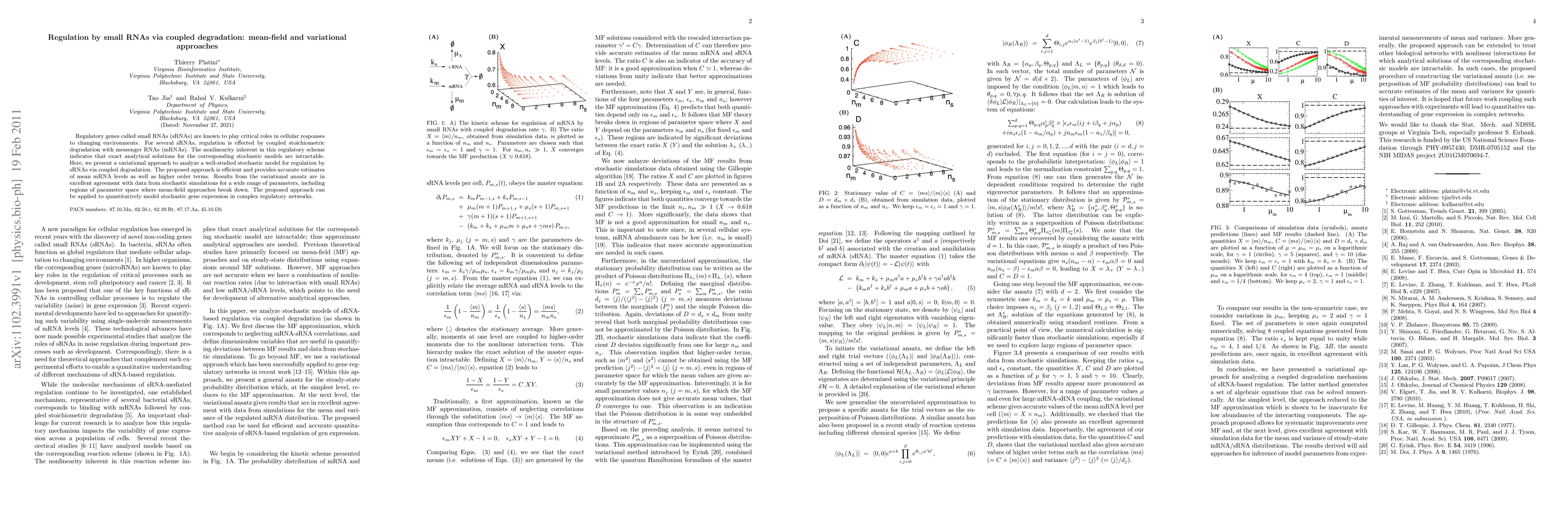 This paper presents a variational approach to analyze the stochastic regulation of genes by small RNAs via coupled degradation, providing accurate estimates of mean mRNA levels and higher-order terms. The method outperforms mean-field approaches, especially in parameter regions where they fail, and can model complex regulatory networks.