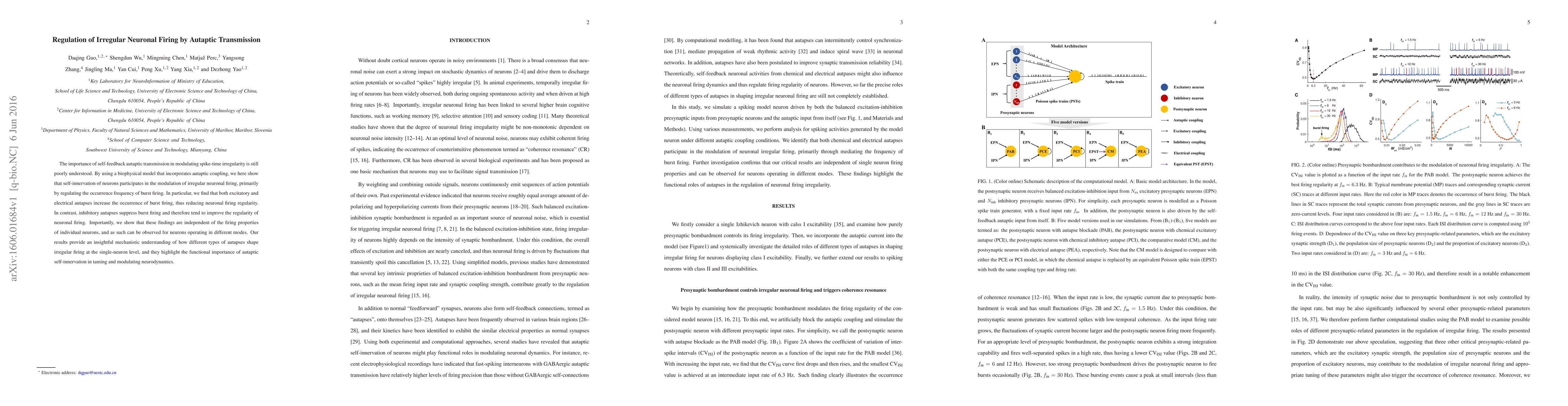This study reveals that autaptic transmission modulates neuronal firing irregularity by regulating burst firing frequency. Excitatory and electrical autapses increase burst firing, reducing firing regularity, while inhibitory autapses suppress burst firing, enhancing regularity, independent of individual neuron firing properties.
