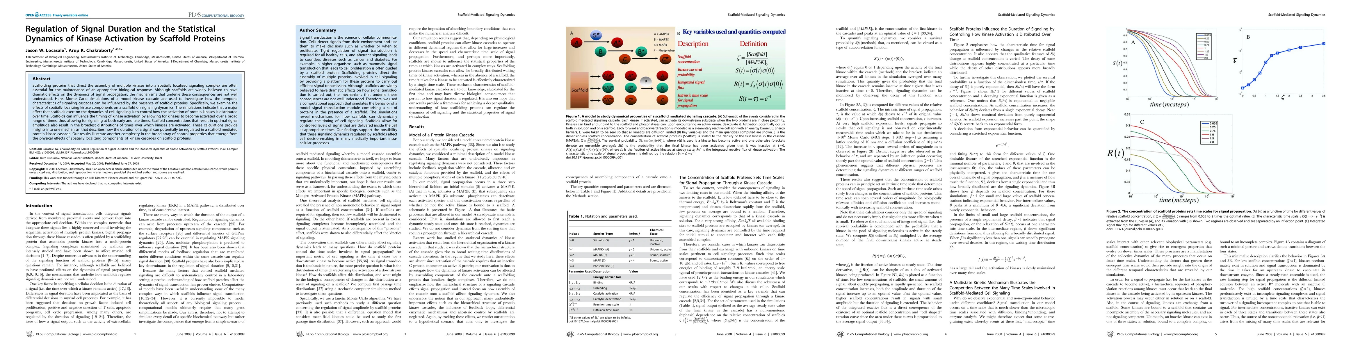 This paper uses Monte Carlo simulations to explore how scaffold proteins influence the temporal dynamics of kinase activation in signaling cascades. It finds that scaffolds regulate the duration of signaling by allowing kinases to activate over a broad range of times, thus optimizing signal amplitude and providing a mechanism for signal duration regulation.