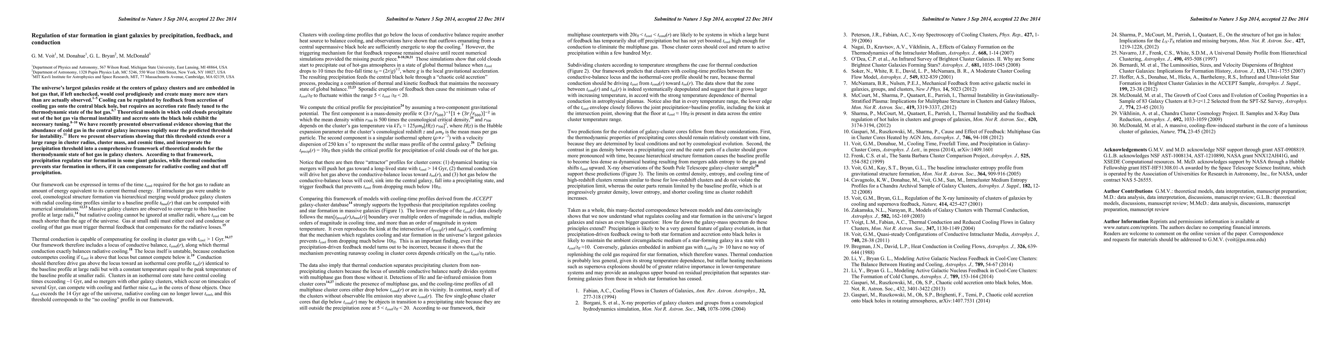 This paper investigates how star formation in giant galaxies is regulated by precipitation, feedback from central black holes, and thermal conduction. Observations show that cold gas abundance increases near the threshold for thermal instability, suggesting precipitation plays a key role in regulating star formation, while thermal conduction can suppress star formation in other galaxies by compensating for radiative cooling.