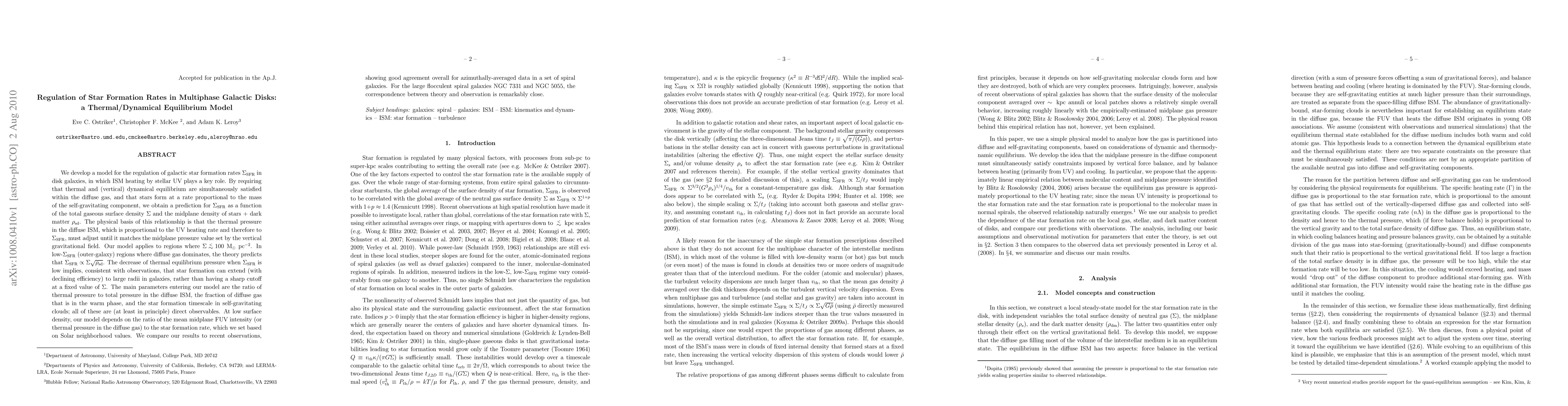 This paper develops a thermal/dynamical equilibrium model to regulate star formation rates in disk galaxies, emphasizing the role of ISM heating by stellar UV. The model predicts star formation rates as a function of gaseous surface density and the density of stars and dark matter, showing good agreement with observations in spiral galaxies.