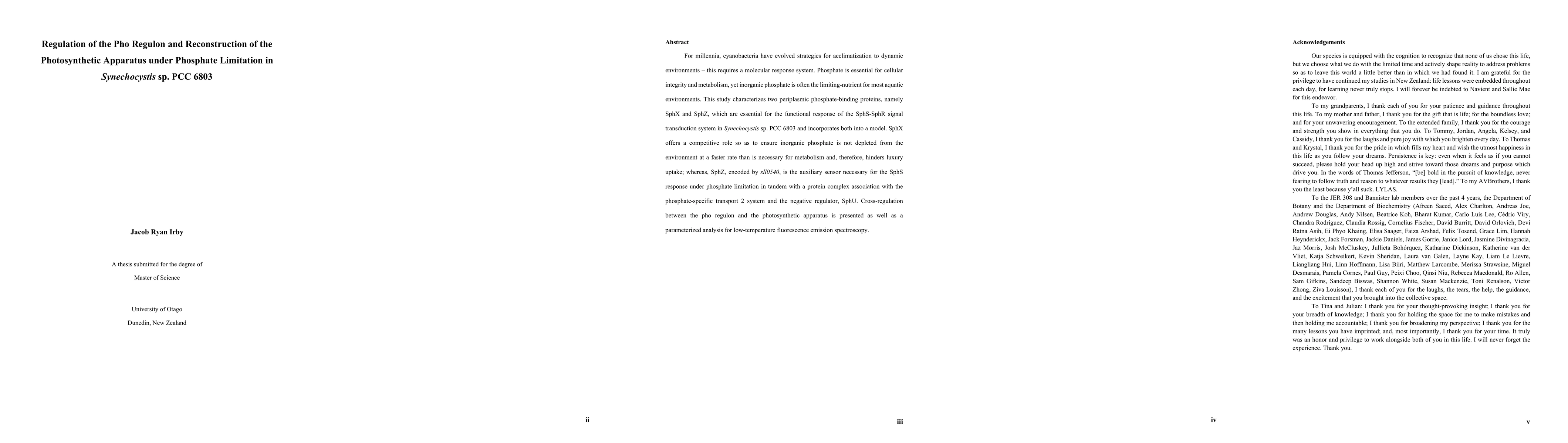 For millennia, cyanobacteria have evolved strategies for acclimatization to dynamic environments- this requires a molecular response system. Phosphate is essential for cellular integrity and metabolism, yet inorganic phosphate is often the limiting nutrient for most aquatic environments. This study characterizes two periplasmic phosphate-binding proteins, namely SphX and SphZ, which are essential for the functional response of the SphS-SphR signal transduction system in Synechocystis sp. PCC 6803 and incorporates both into a model. SphX offers a competitive role so as to ensure inorganic phosphate is not depleted from the environment at a faster rate than is necessary for metabolism and, therefore, hinders luxury uptake; whereas, SphZ, encoded by sll0540, is the auxiliary sensor necessary for the SphS response under phosphate limitation in tandem with a protein complex association with the phosphate-specific transport 2 system and the negative regulator, SphU. Cross-regulation between the pho regulon and the photosynthetic apparatus is presented as well as a parameterized analysis for low-temperature fluorescence emission spectroscopy.