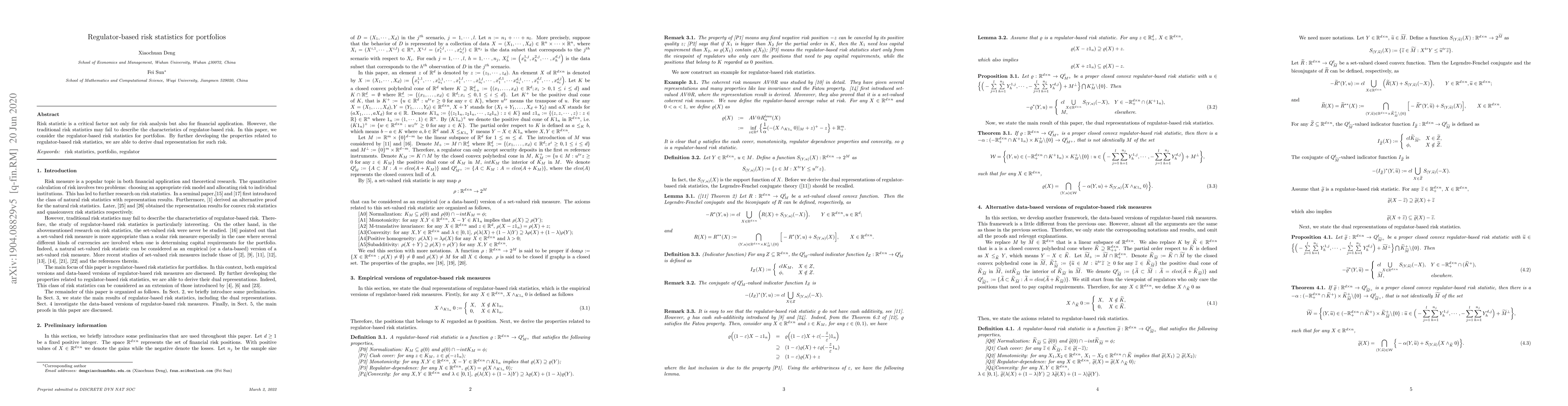 This paper explores regulator-based risk statistics for portfolios, developing their properties to derive a dual representation for such risk, addressing limitations of traditional risk statistics in describing regulator-based risk characteristics.