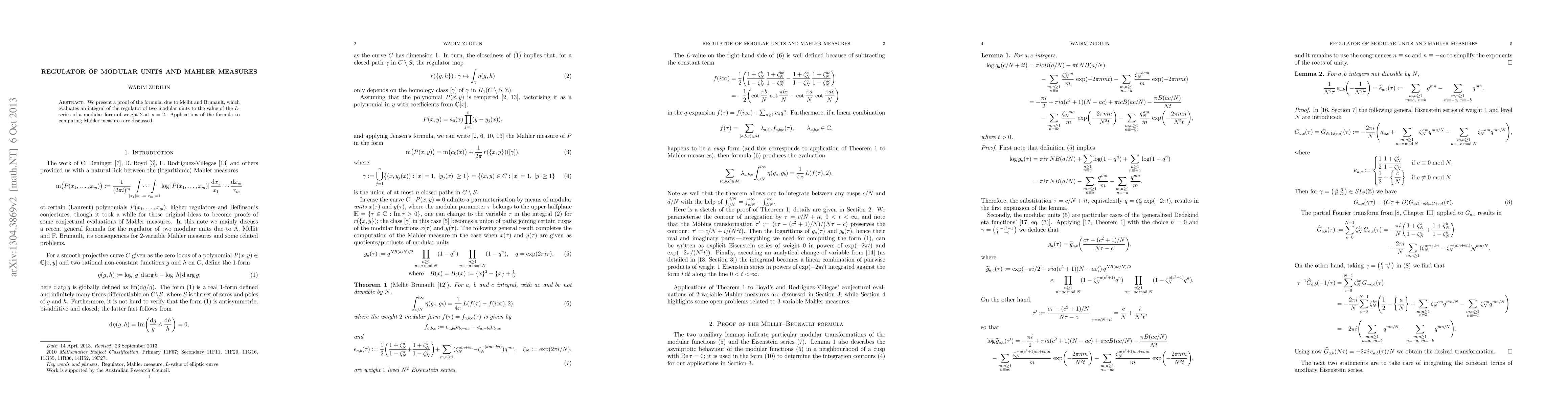 This paper proves Mellit and Brunault's formula linking the regulator of modular units to the $L$-series of a weight 2 modular form at $s=2$, with applications towards calculating Mahler measures.