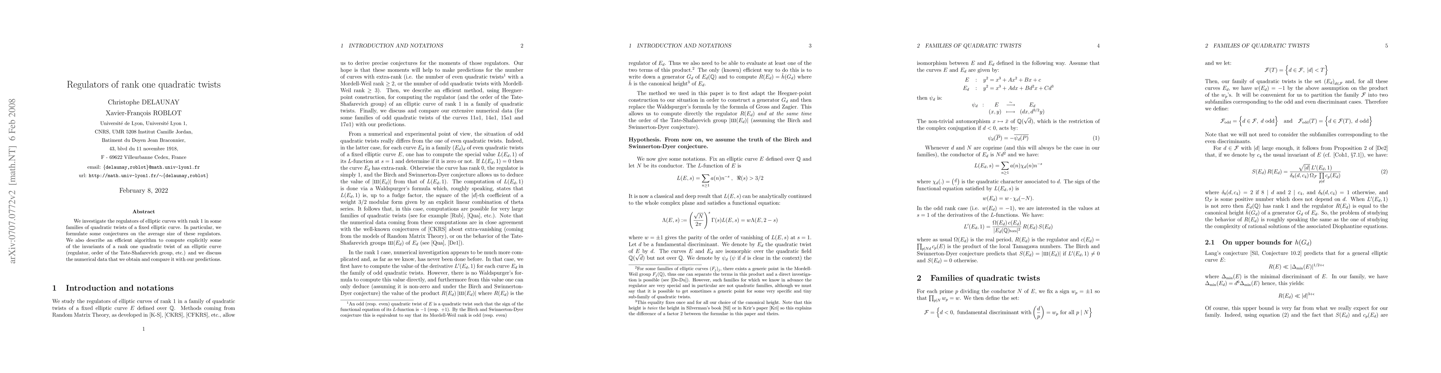 This paper studies regulators of elliptic curves with rank 1 across families of quadratic twists of a base curve, proposing conjectures on their average size. It also develops an efficient algorithm for computing invariants like regulators and Tate-Shafarevich group orders of odd quadratic twists, and discusses the numerical data supporting these conjectures.