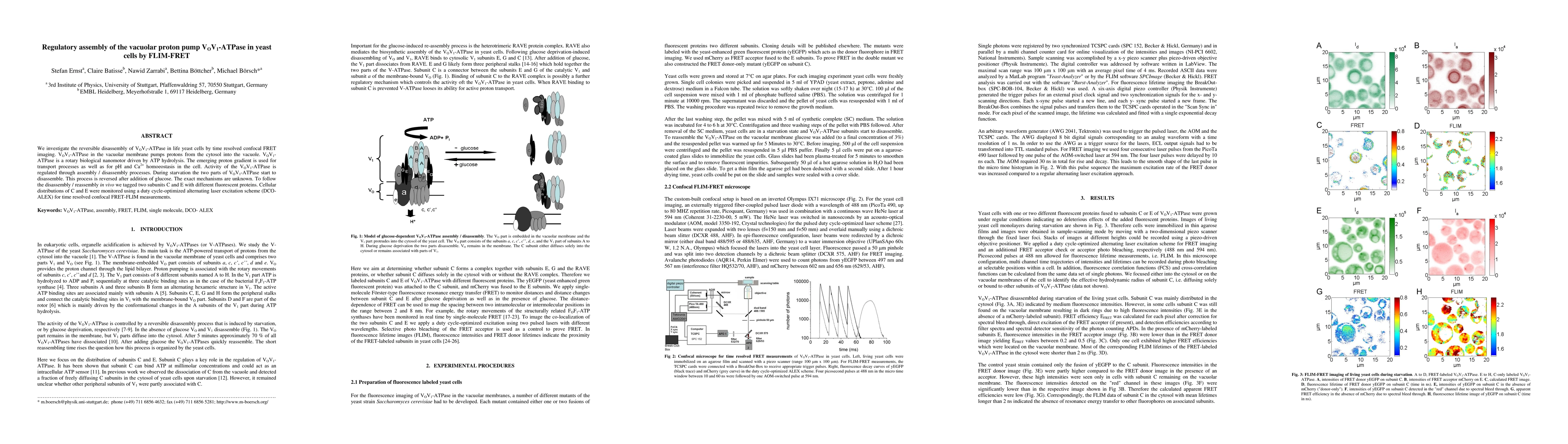 This study uses time-resolved FRET imaging to investigate the reversible disassembly of VOV1-ATPase in yeast cells during starvation and its reassembly upon glucose addition, employing fluorescently tagged subunits C and E for monitoring assembly dynamics in vivo.