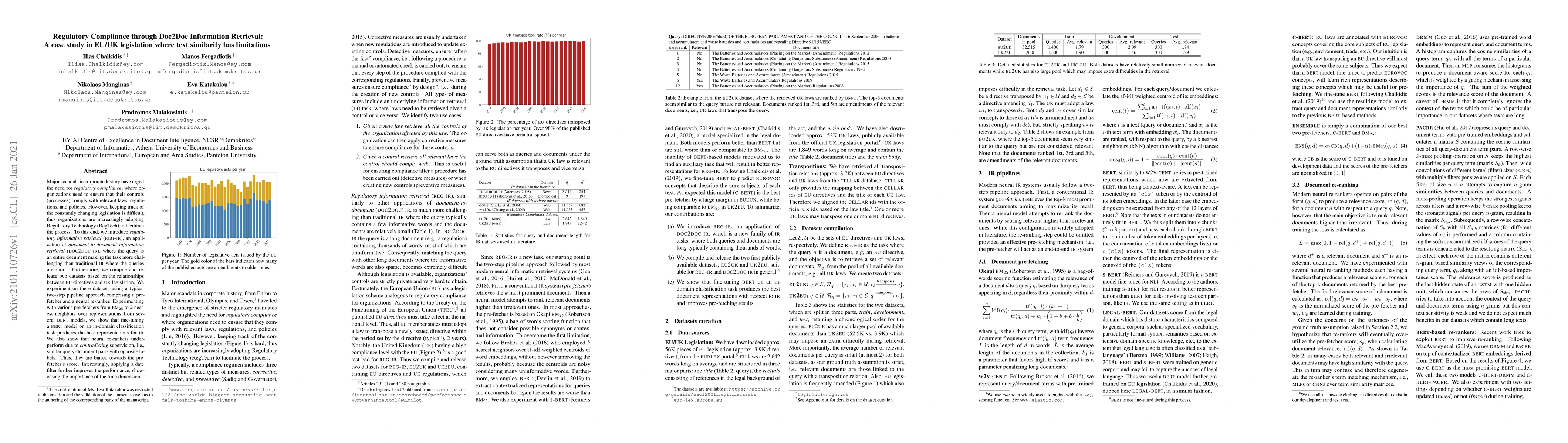 Major scandals in corporate history have urged the need for regulatory compliance, where organizations need to ensure that their controls (processes) comply with relevant laws, regulations, and policies. However, keeping track of the constantly changing legislation is difficult, thus organizations are increasingly adopting Regulatory Technology (RegTech) to facilitate the process. To this end, we introduce regulatory information retrieval (REG-IR), an application of document-to-document information retrieval (DOC2DOC IR), where the query is an entire document making the task more challenging than traditional IR where the queries are short. Furthermore, we compile and release two datasets based on the relationships between EU directives and UK legislation. We experiment on these datasets using a typical two-step pipeline approach comprising a pre-fetcher and a neural re-ranker. Experimenting with various pre-fetchers from BM25 to k nearest neighbors over representations from several BERT models, we show that fine-tuning a BERT model on an in-domain classification task produces the best representations for IR. We also show that neural re-rankers under-perform due to contradicting supervision, i.e., similar query-document pairs with opposite labels. Thus, they are biased towards the pre-fetcher's score. Interestingly, applying a date filter further improves the performance, showcasing the importance of the time dimension.