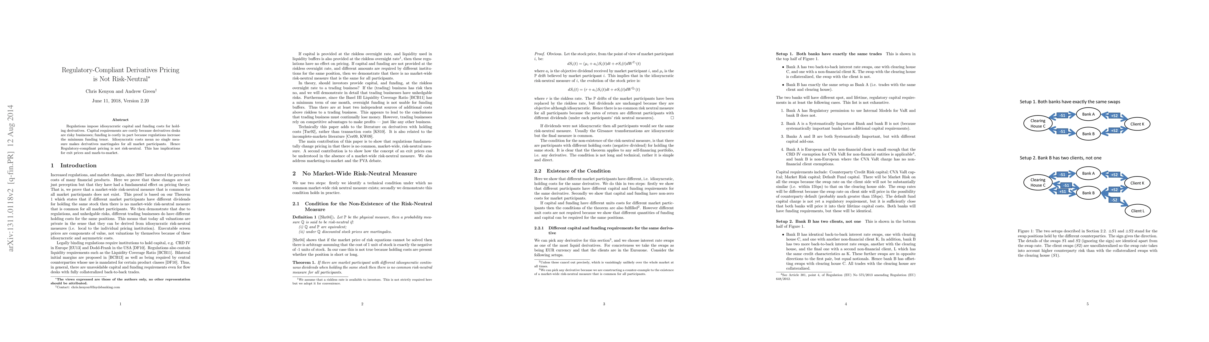 This paper argues that regulatory-compliant derivatives pricing isn't risk-neutral due to unique capital and funding costs. These costs, stemming from risky derivatives desks and extended funding periods, prevent a single measure from making derivatives martingales for all participants, impacting exit prices and mark-to-market practices.
