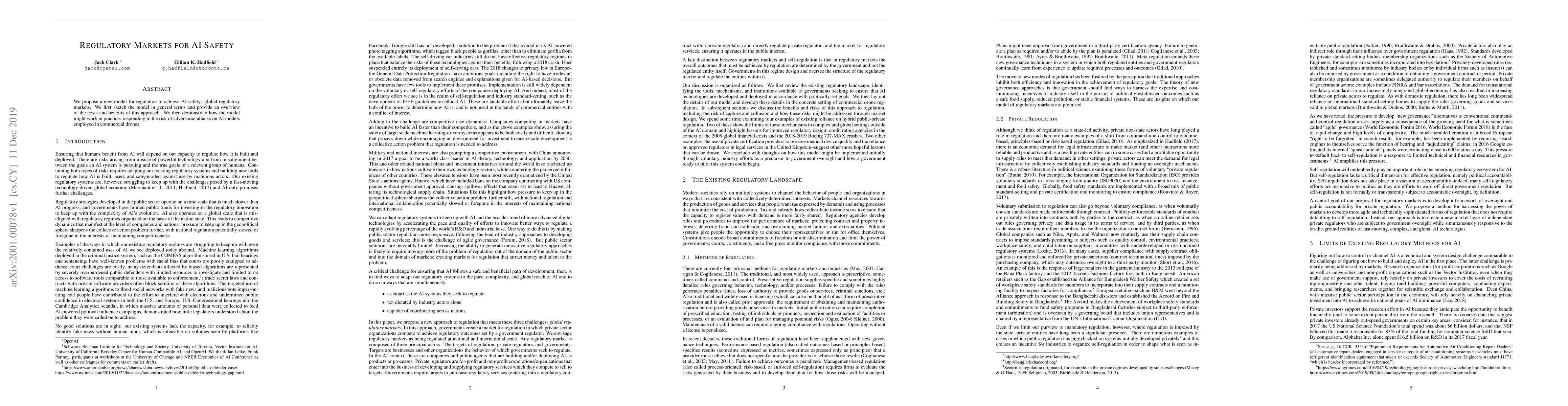 We propose a new model for regulation to achieve AI safety: global regulatory markets. We first sketch the model in general terms and provide an overview of the costs and benefits of this approach. We then demonstrate how the model might work in practice: responding to the risk of adversarial attacks on AI models employed in commercial drones.