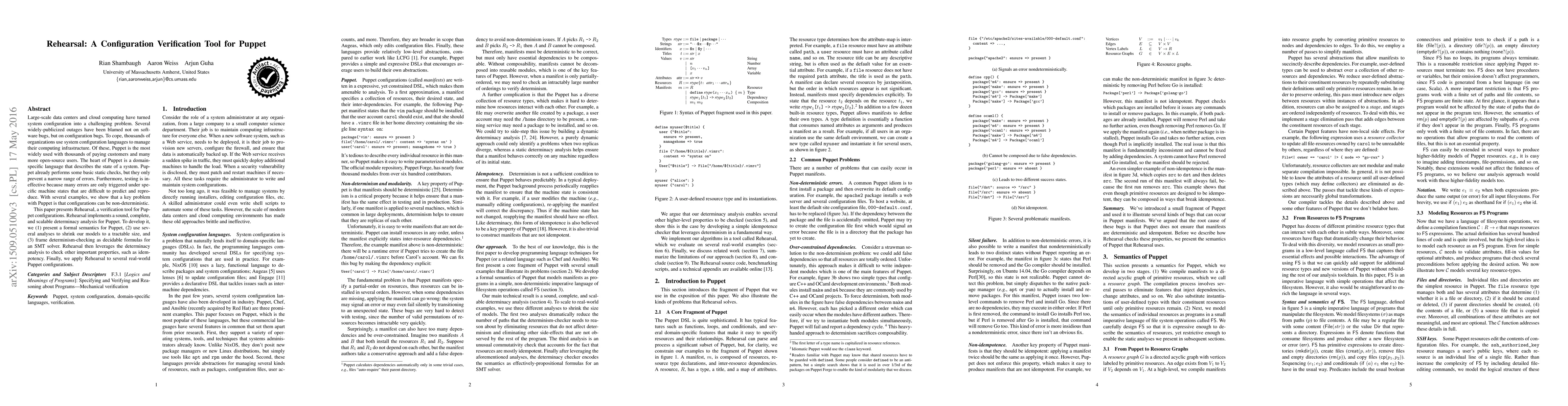 This paper introduces Rehearsal, a verification tool for Puppet configurations, which implements a sound, complete, and scalable determinacy analysis to address non-deterministic issues in Puppet. The tool is developed using formal semantics, model shrinking, and decidable formulas for SMT solvers to ensure effective configuration management.