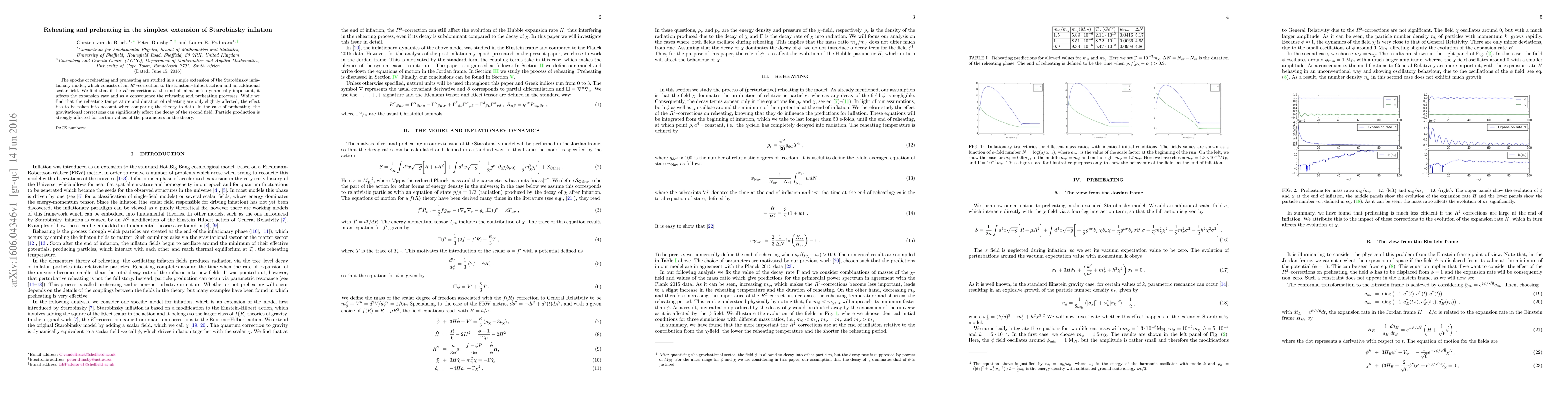 The epochs of reheating and preheating are studied in a simple extension of the Starobinsky inflationary model, which consists of an $R^2$--correction to the Einstein--Hilbert action and an additional scalar field. We find that if the $R^2$--correction at the end of inflation is dynamically important, it affects the expansion rate and as a consequence the reheating and preheating processes. While we find that the reheating temperature and duration of reheating are only slightly affected, the effect has to be taken into account when comparing the theory to data. In the case of preheating, the gravitational corrections can significantly affect the decay of the second field. Particle production is strongly affected for certain values of the parameters in the theory.