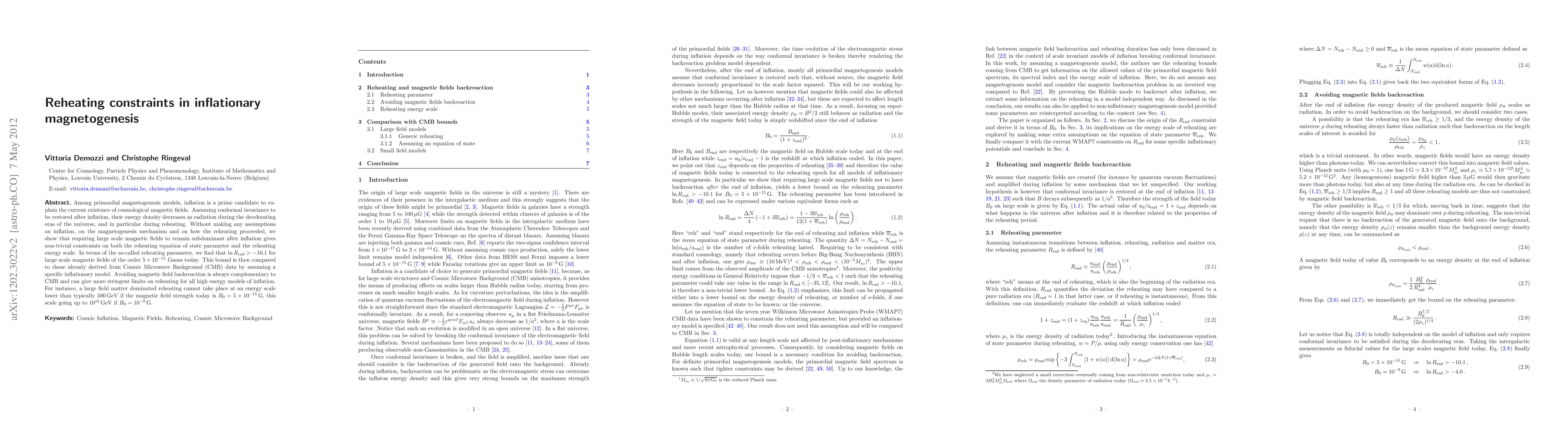 This paper investigates constraints on reheating in inflationary magnetogenesis, showing that maintaining large-scale magnetic fields as subdominant post-inflation imposes limits on the reheating equation of state and energy scale. The derived constraint ln(Rrad) > -10.1 for magnetic fields of 5 x 10^(-15) Gauss complements CMB-derived limits and suggests high energy models must avoid magnetic field backreaction.