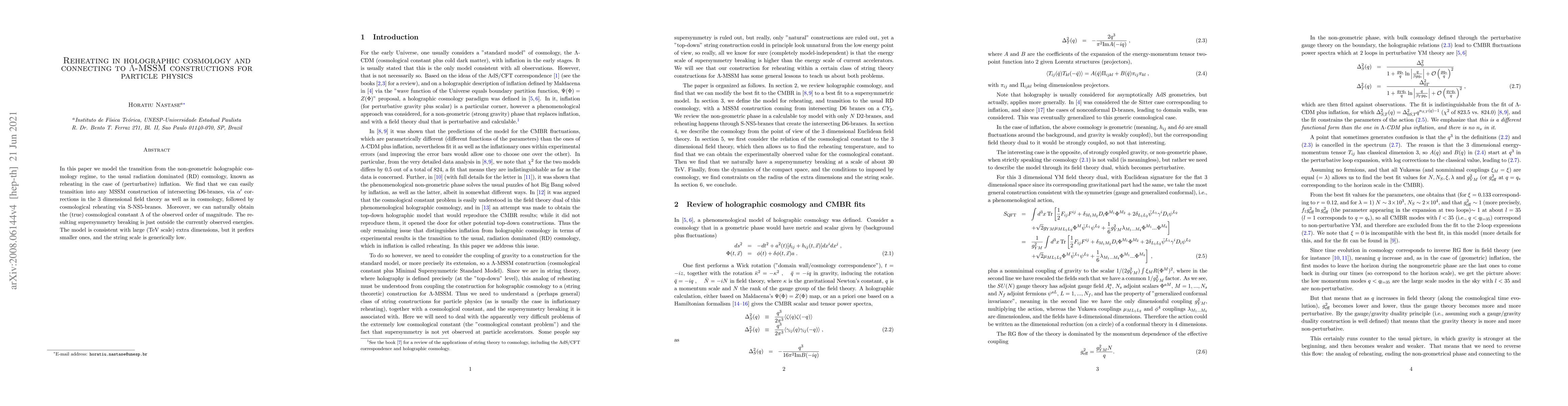 In this paper we model the transition from the non-geometric holographic cosmology regime, to the usual radiation dominated (RD) cosmology, known as reheating in the case of (perturbative) inflation. We find that we can easily transition into any MSSM construction of intersecting D6-branes, via $\alpha'$ corrections in the 3 dimensional field theory as well as in cosmology, followed by cosmological reheating via S-NS5-branes. Moreover, we can naturally obtain the (true) cosmological constant $\Lambda$ of the observed order of magnitude. The resulting supersymmetry breaking is just outside the currently observed energies. The model is consistent with large (TeV scale) extra dimensions, but it prefers smaller ones, and the string scale is generically low.