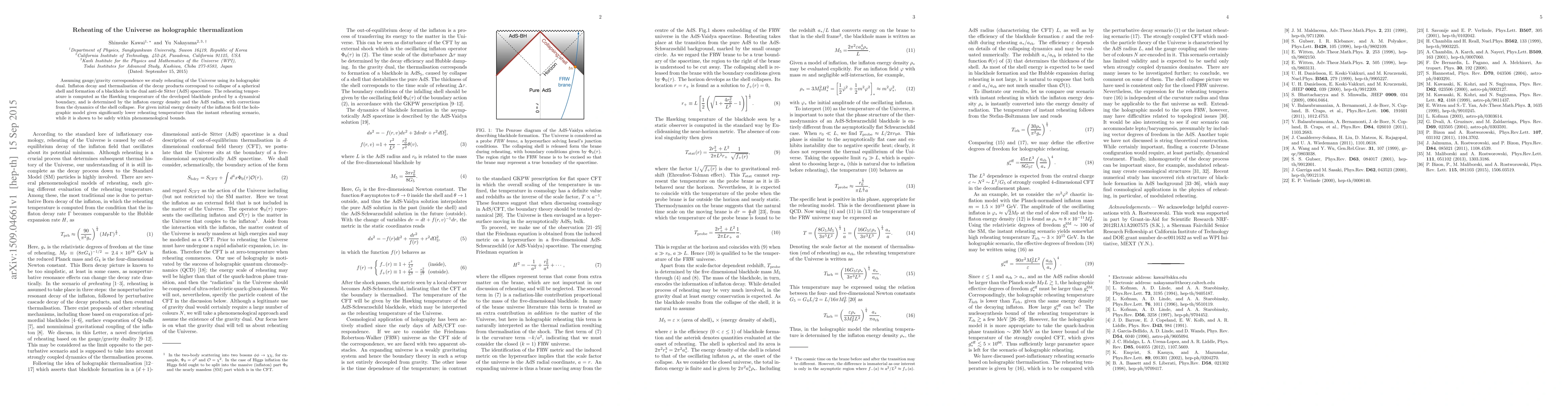 The research applies the gauge/gravity correspondence to study the reheating of the Universe using its holographic dual, modeling inflaton decay and thermalization as a spherical shell collapse forming a black hole in anti-de Sitter (AdS) spacetime.