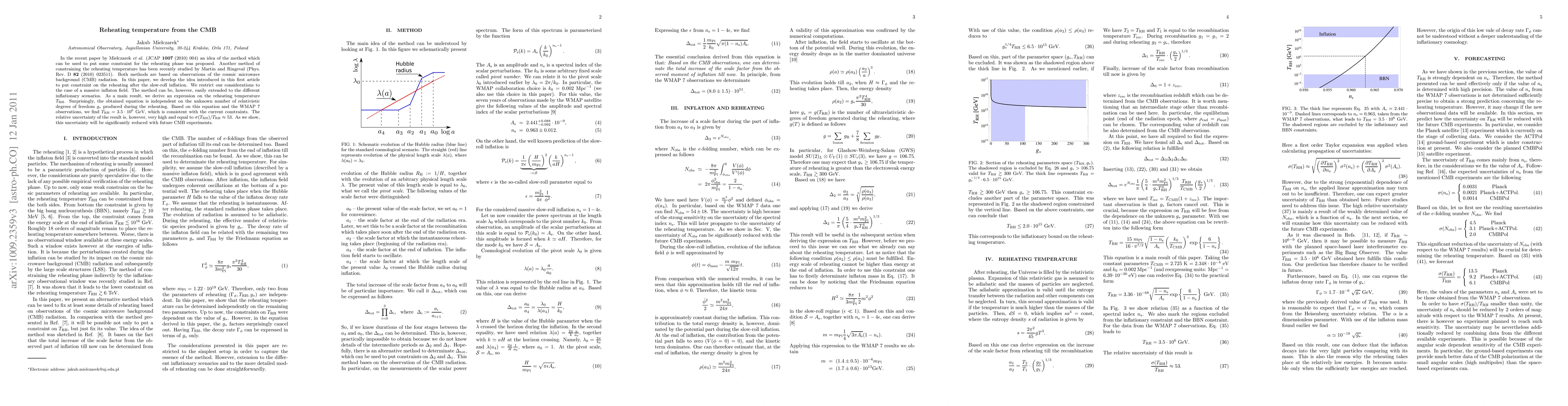 In the recent paper by Mielczarek \emph{et al.} (JCAP {\bf 1007} (2010) 004) an idea of the method which can be used to put some constraint for the reheating phase was proposed. Another method of constraining the reheating temperature has been recently studied by Martin and Ringeval (Phys.\ Rev.\ D {\bf 82} (2010) 023511). Both methods are based on observations of the cosmic microwave background (CMB) radiation. In this paper, we develop the idea introduced in this first article to put constraint on the reheating after the slow-roll inflation. We restrict our considerations to the case of a massive inflaton field. The method can be, however, easily extended to the different inflationary scenarios. As a main result, we derive an expression on the reheating temperature $T_{\text{RH}}$. Surprisingly, the obtained equation is independent on the unknown number of relativistic degrees of freedom $g_*$ produced during the reheating. Based on this equation and the WMAP 7 observations, we find $T_{\text{RH}}=3.5\cdot 10^6$ GeV, which is consistent with the current constraints. The relative uncertainty of the result is, however, very high and equal to $\sigma(T_{\text{RH}})/T_{\text{RH}} \approx 53$. As we show, this uncertainty will be significantly reduced with future CMB experiments.