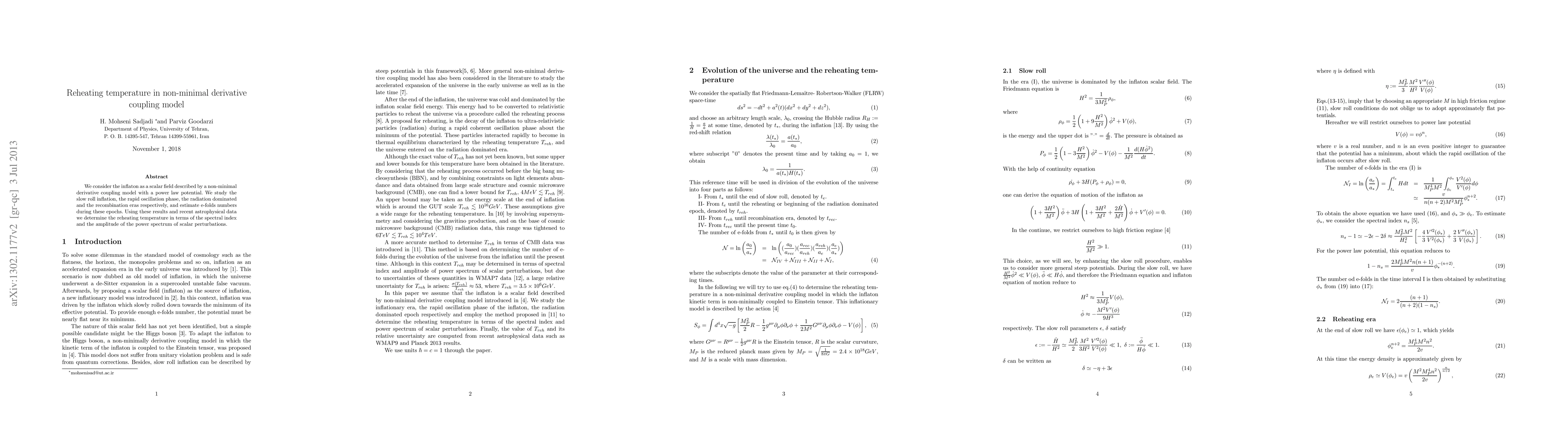 We consider the inflaton as a scalar field described by a non-minimal derivative coupling model with a power law potential. We study the slow roll inflation, the rapid oscillation phase, the radiation dominated and the recombination eras respectively, and estimate e-folds numbers during these epochs. Using these results and recent astrophysical data we determine the reheating temperature in terms of the spectral index and the amplitude of the power spectrum of scalar perturbations.