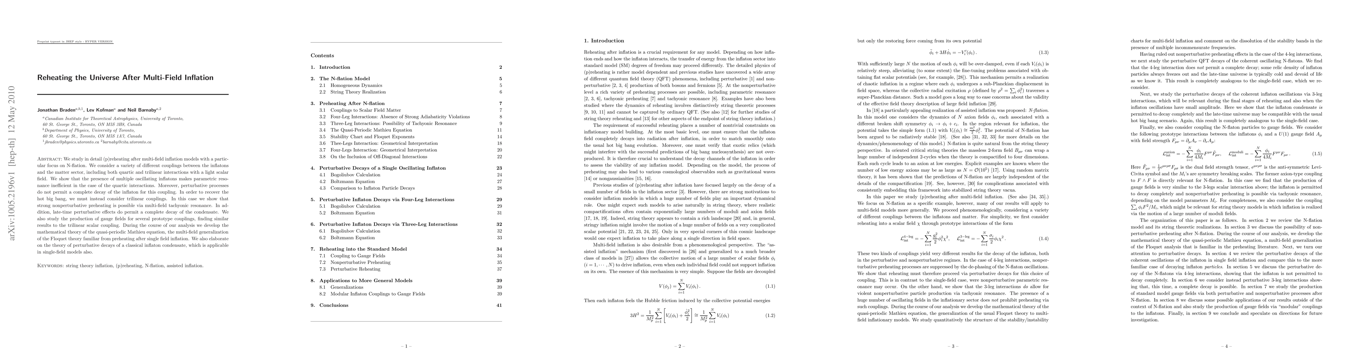 We study in detail (p)reheating after multi-field inflation models with a particular focus on N-flation. We consider a variety of different couplings between the inflatons and the matter sector, including both quartic and trilinear interactions with a light scalar field. We show that the presence of multiple oscillating inflatons makes parametric resonance inefficient in the case of the quartic interactions. Moreover, perturbative processes do not permit a complete decay of the inflaton for this coupling. In order to recover the hot big bang, we must instead consider trilinear couplings. In this case we show that strong nonperturbative preheating is possible via multi-field tachyonic resonance. In addition, late-time perturbative effects do permit a complete decay of the condensate. We also study the production of gauge fields for several prototype couplings, finding similar results to the trilinear scalar coupling. During the course of our analysis we develop the mathematical theory of the quasi-periodic Mathieu equation, the multi-field generalization of the Floquet theory familiar from preheating after single field inflation. We also elaborate on the theory of perturbative decays of a classical inflaton condensate, which is applicable in single-field models also.