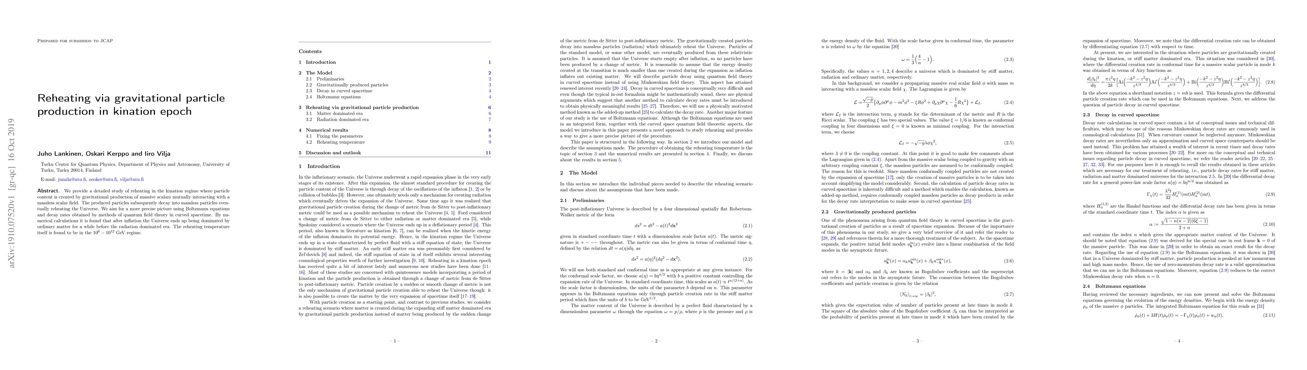 This paper investigates reheating during the kination epoch through gravitational production of massive scalars, which decay into massless particles, eventually reheating the Universe. The study uses Boltzmann equations and quantum field theory methods to determine that the reheating temperature ranges from $10^6$ to $10^{12}$ GeV, with the Universe transitioning from matter to radiation dominance.