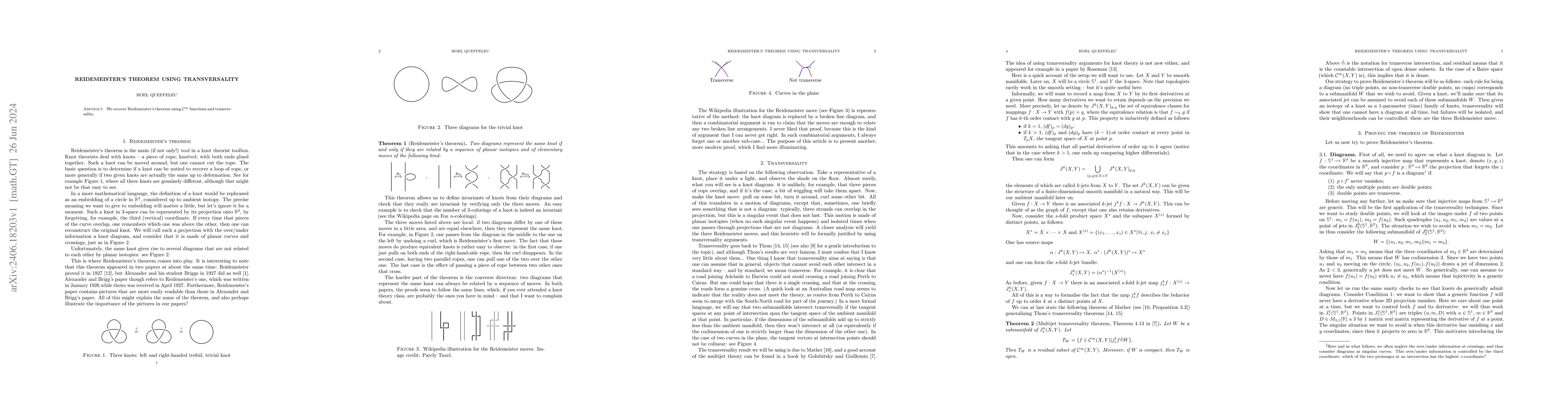 Summary: This paper demonstrates Reidemeister's theorem—a foundational result in knot theory—by employing smooth functions and the transversality principle to analyze and classify smooth knot diagrams.
