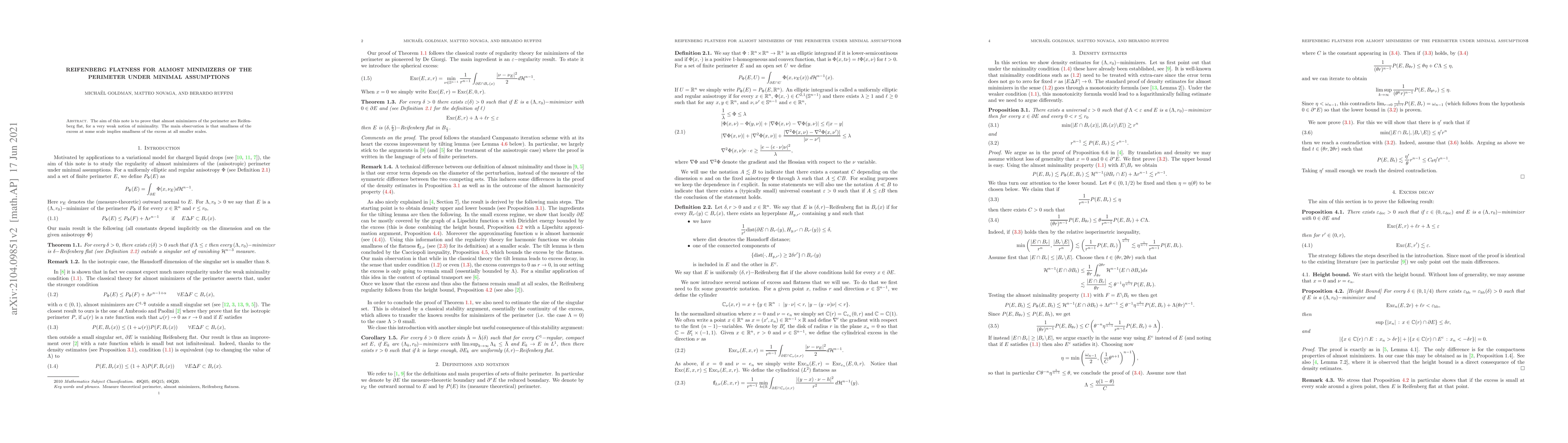 This paper proves that almost-minimizers of surface area, under minimal assumptions, exhibit Reifenberg flatness. It highlights that if excess is small at one scale, it remains small at all smaller scales.