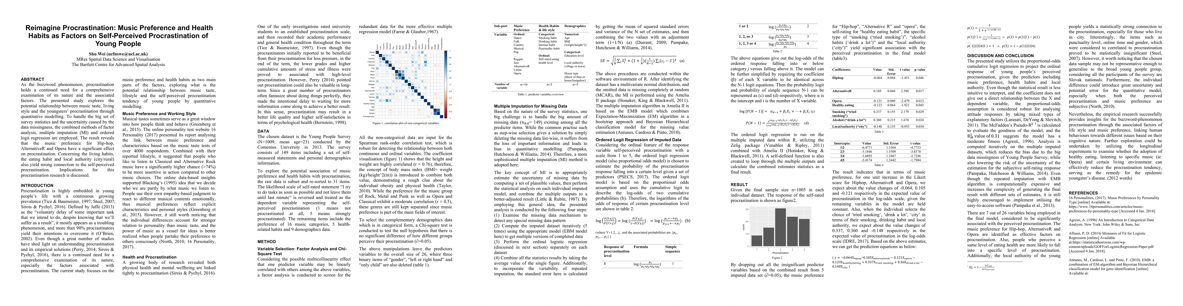 As the buzzword phenomenon, procrastination holds a continued need for a comprehensive examination of its nature and the associated factors. The presented study explores the potential relationship between music taste, life style and the youngsters' procrastination through quantitative modelling. To handle the big set of survey statistics and the uncertainty caused by the data missingness, the combined methods of factor analysis, multiple imputation (MI) and Ordered logit regression are employed. The result reveals that the music preference for Hip-hop, AlternativeR and Opera have a significant effect on procrastination. Concerning the living habits, the eating habit and local authority (city/rural) also yield strong connection to the self-perceived procrastination. Implications for this procrastination research is discussed.